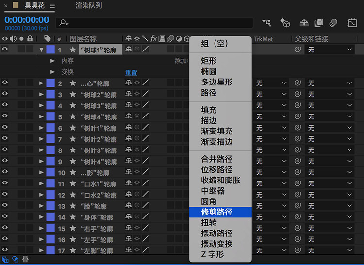 此時圖層均被轉(zhuǎn)換為矢量形狀,所有AI圖層在這個時候就可以都刪除了,點開其中一個圖層,怎么樣,可以添加諸如“修剪路徑”、修改顏色等等的效果啦。