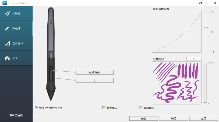 關(guān)于數(shù)位板和感壓筆的感壓系數(shù),根據(jù)自己平時作畫的習慣設(shè)置好各項參數(shù)就可以了。另外,數(shù)位板上的8個快捷鍵是不固定的,可在驅(qū)動上按照平時習慣用的快捷鍵自由設(shè)置。
