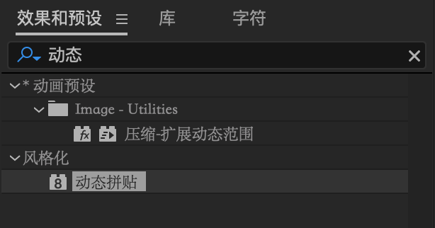 在【效果和預(yù)設(shè)】里添加【動(dòng)態(tài)拼貼】效果