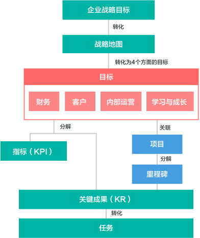 藍(lán)云軟件的目標(biāo)管理采用「平衡計分卡+OKR+KPI」的方法,用平衡計分卡制定公司目標(biāo),再用 OKR 分解到團隊和個人, 并用KPI進(jìn)行團隊及個人的考核,來進(jìn)行全公司的目標(biāo)管理。