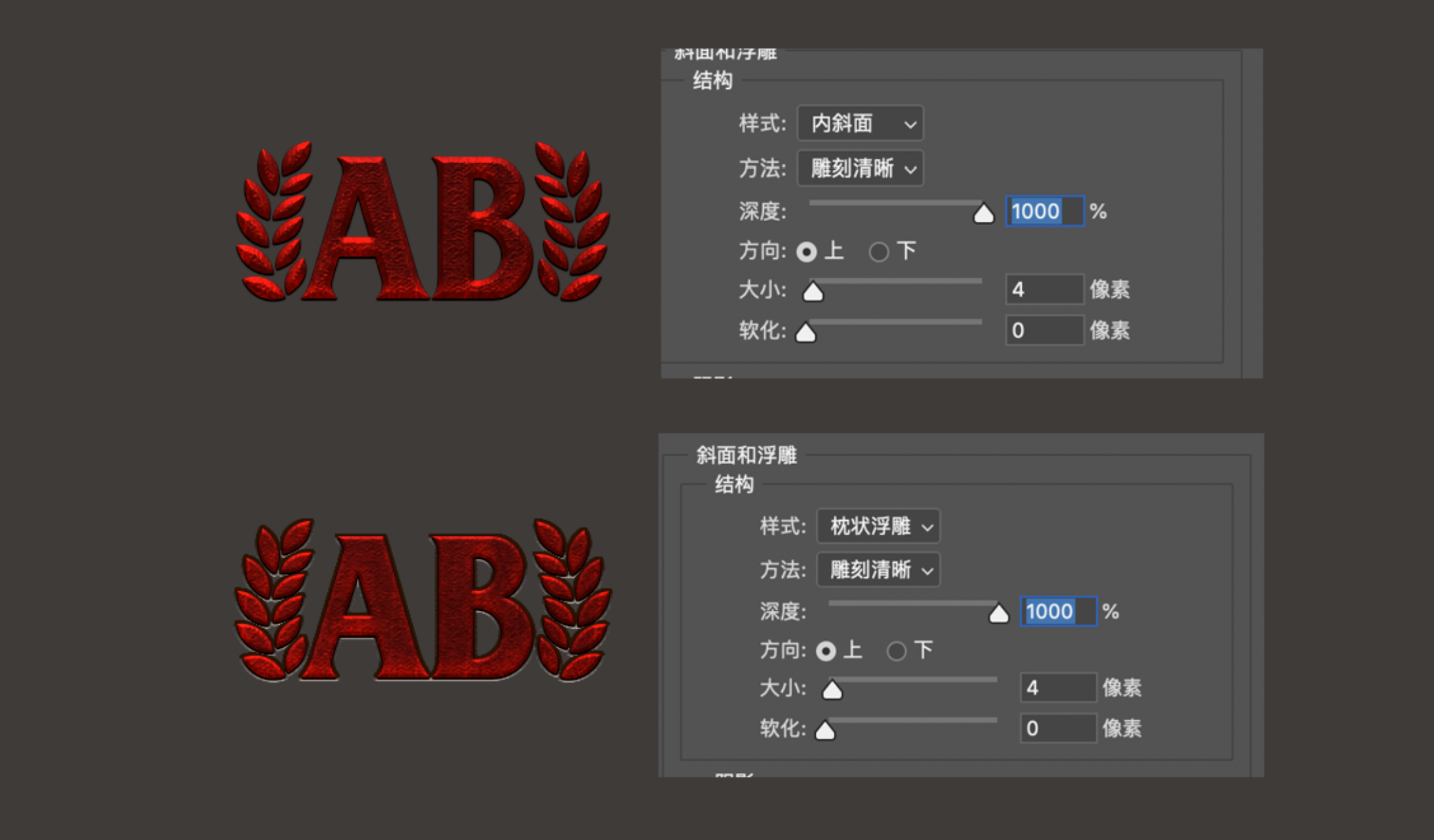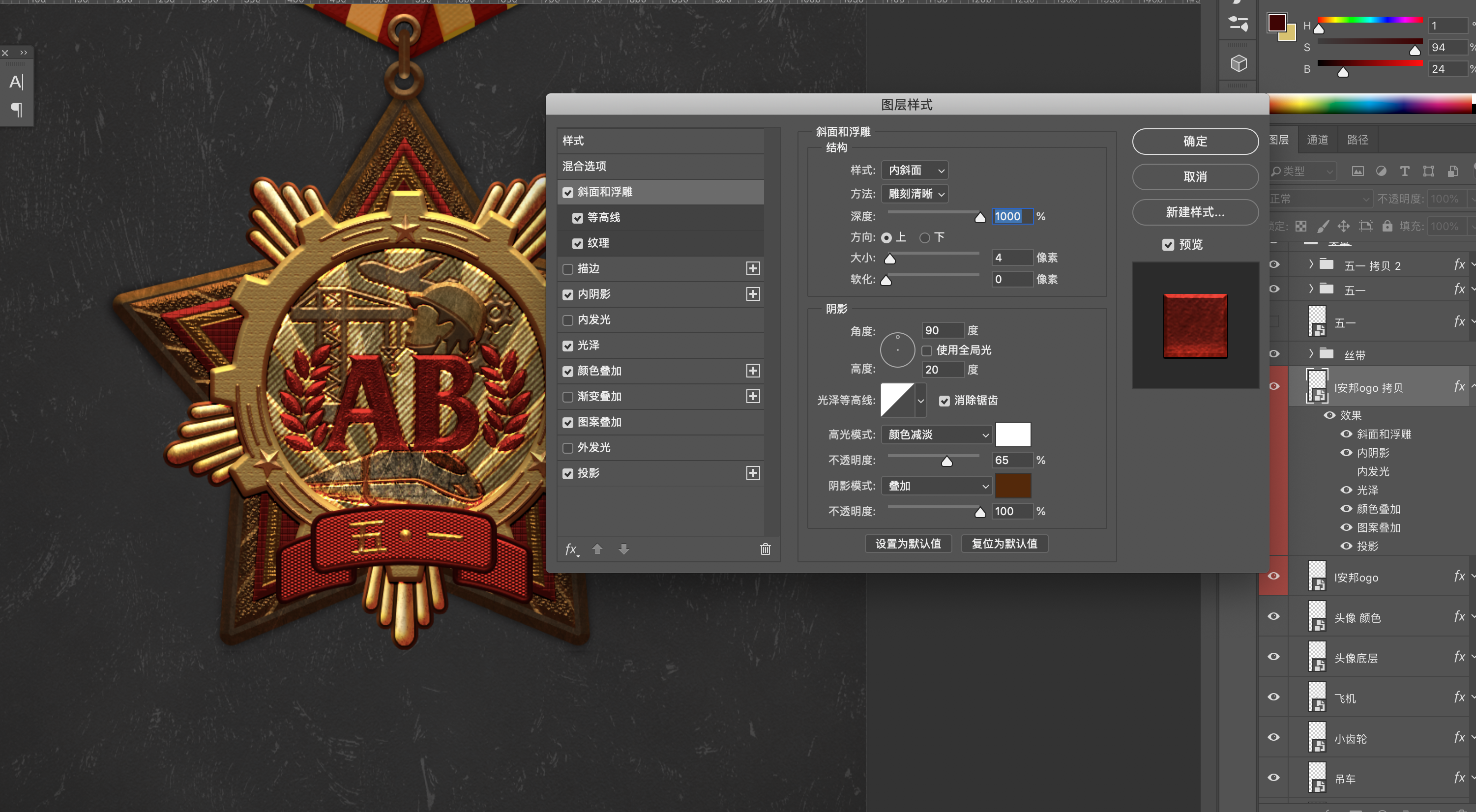 這里要注意的是斜面浮雕的樣式,可以去試一下每個樣式,來得到最佳的效果。至于顏色和紋理可以根據(jù)自己的喜好或者具體情況去調(diào)整。