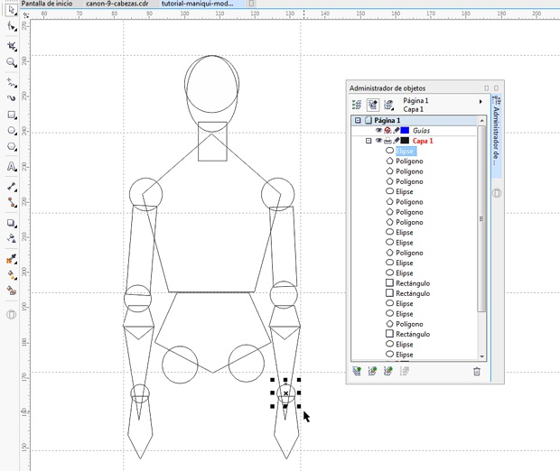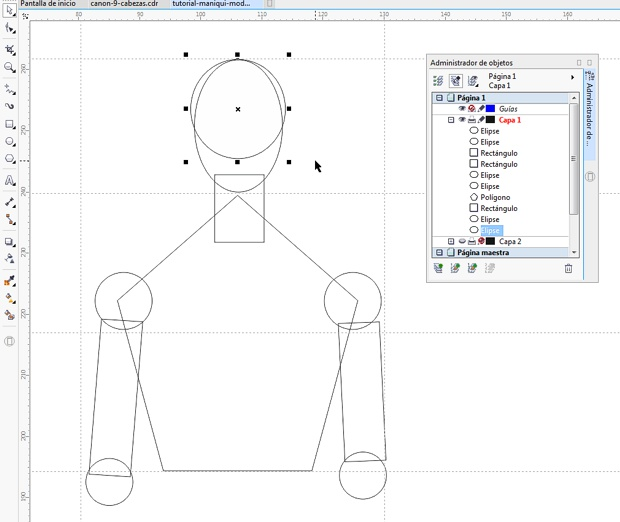 首先用兩個(gè)橢圓和一個(gè)矩形(橢圓和矩形工具)繪制頭部和頸部。然后,多邊形工具創(chuàng)建一個(gè)五角形(五邊多邊形)作為軀干,而橢圓工具則創(chuàng)建另外兩個(gè)圓作為肩膀。創(chuàng)建兩個(gè)長(zhǎng)方形,用選擇工具旋轉(zhuǎn)幾度以達(dá)到適當(dāng)?shù)膬A角,另外兩個(gè)圓創(chuàng)建手肘,完成身體的頂部,如下圖所示。
