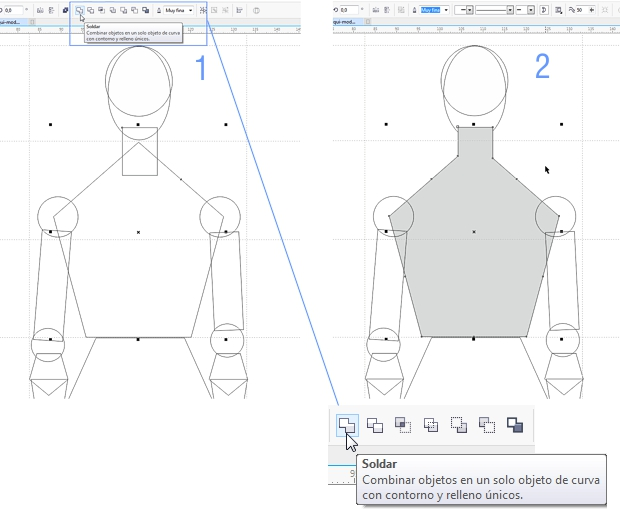 我們首先將軀干和頸部結(jié)合起來(lái),然后選擇兩個(gè)對(duì)象(五邊形和矩形),然后單擊上屬性欄的焊接按鈕,看到兩個(gè)對(duì)象合并成一個(gè)對(duì)象。