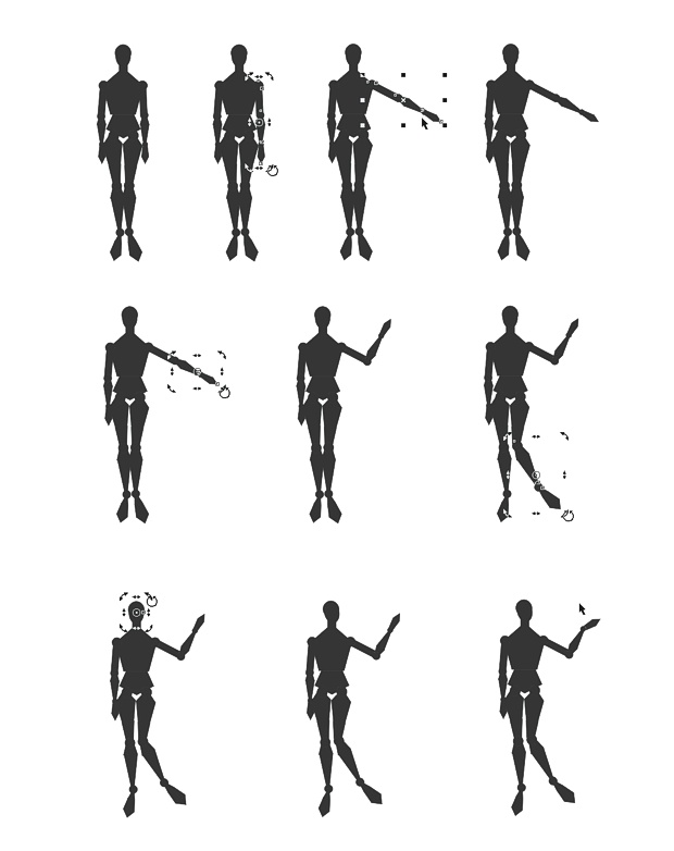 通過(guò)選擇工具及其旋轉(zhuǎn)和移動(dòng)選項(xiàng),您可以選擇關(guān)節(jié),并為新姿勢(shì)的模特提供您想要的,可能性是無(wú)限的,比如下圖中的姿勢(shì)。