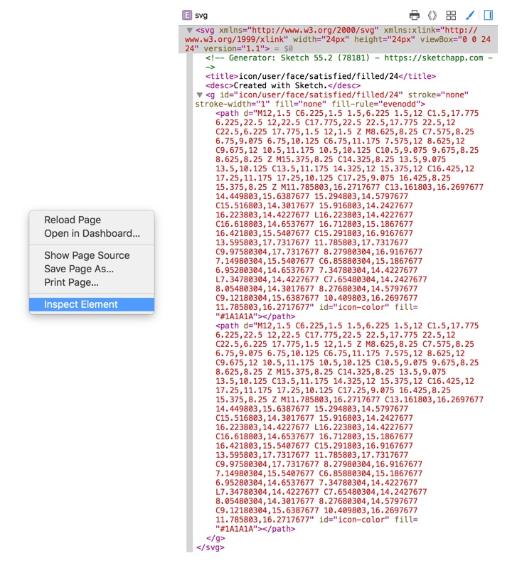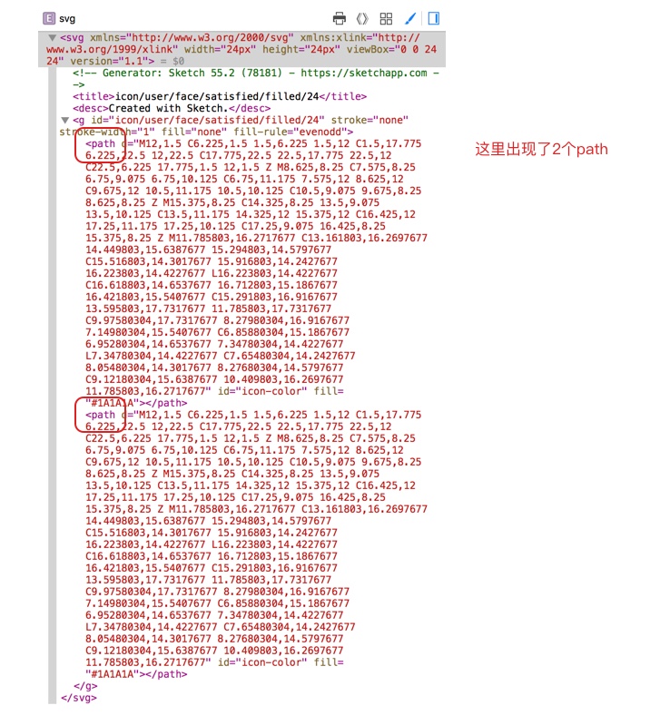path是路徑的意思,做設(shè)計(jì)的都知道路徑是有很多個(gè)錨點(diǎn)連在一起組成的,path后面那么多數(shù)字就是錨點(diǎn)的坐標(biāo)。復(fù)雜的圖形錨點(diǎn)就多了,但是我們這個(gè)笑臉很簡(jiǎn)單,后面應(yīng)該有優(yōu)化的空間。關(guān)鍵是,我們的笑臉只有一個(gè)面,不應(yīng)該出現(xiàn)兩個(gè)path,這就是黑臉的原因了,原來(lái)是眼睛嘴巴的位置填充了多余的一個(gè)路徑。非常遺憾Sketch解決不了這個(gè)問(wèn)題,只能AI上了