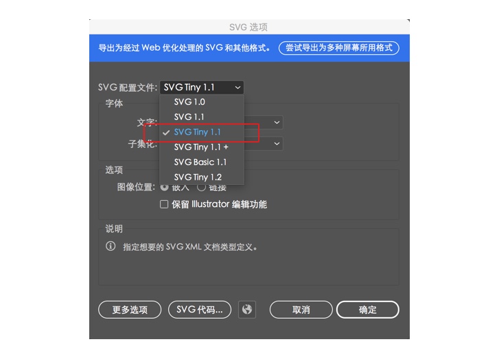 刪掉之后用保存為,選擇SVG格式,這里需要選擇SVG Tiny1.1,否則safari瀏覽器會(huì)有不兼容的問(wèn)題