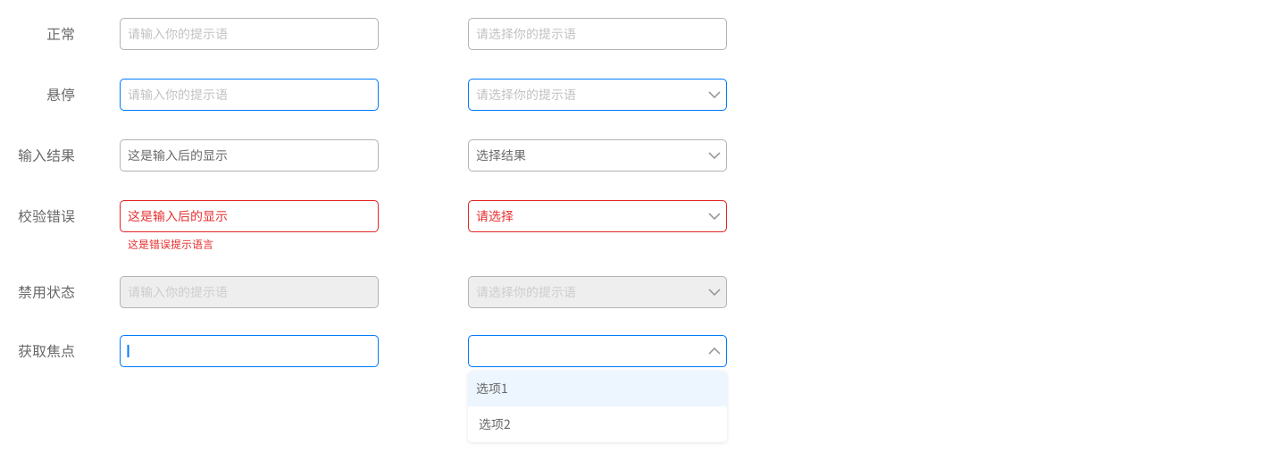 一般樣式分為:默認樣式、獲取焦點、輸入結果、校驗錯誤、禁用狀態(tài)