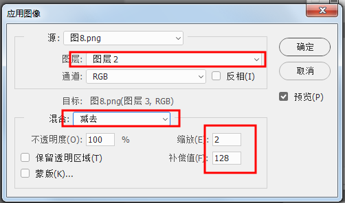 圖層選擇進行過高斯模糊的圖層2,混合選擇:減去,縮放:2,補償值:128.
