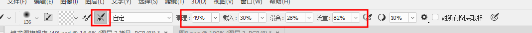 參數(shù)選擇如圖:選項-每次描邊后清理畫筆-點按下去,參數(shù)分別設置為:49%,30%,28%,82%。