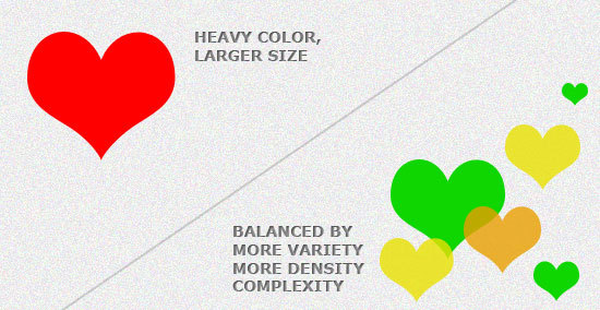 除了色調(diào),顏色還有一些能夠明顯影響視重的屬性。例如,低飽和度的紅色視重更重,相對于黃色或是橘色也更具吸引力。下面這個例子我們可以看到,通過 使用其 他復(fù)雜程度和尺寸不同的元素,我們也能平衡視重。左邊的紅心面積比較大,亮度更高,因此視重比較重。為了視覺平衡,畫布的右邊我們可以增加不同大小的心形 數(shù)量來增加復(fù)雜程度。
