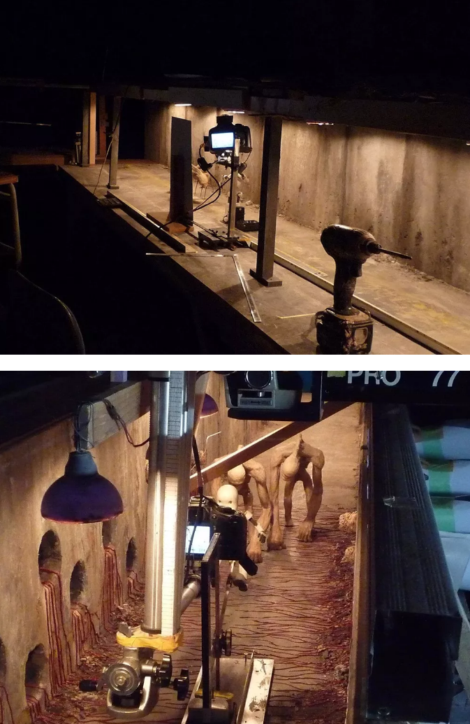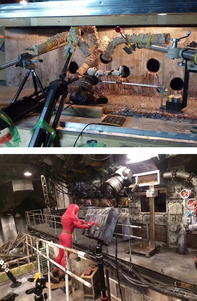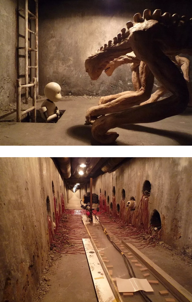 廢頭的場(chǎng)景是在屋內(nèi)制作的廢棄工廠模型里,為了突出主題效果,拍攝時(shí)的燈光基本設(shè)定為昏暗的暖光,配合后期調(diào)色,加上各種逼真的道具,讓整個(gè)場(chǎng)景表現(xiàn)出很壓抑很緊迫的驚悚感。