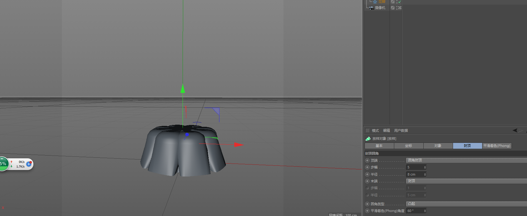4.修改放樣的屬性,選中放樣,將網(wǎng)孔細分U改為115,網(wǎng)孔細分V改為25,勾選有機表格,再切換封頂TAB,選擇圓角封頂,步幅為5,半徑為8cm,這樣果凍的一個模型就基本出來了