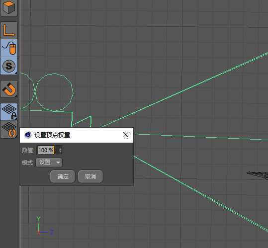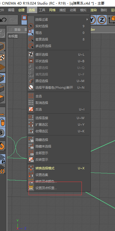 8.接下去就是做果凍動的效果了,將果凍c掉,變?yōu)榭删庉嫷膶ο?,按住shift,點擊創(chuàng)建-變形器-顫動,這樣果凍就有duang的效果了,切換右視圖,使用點模式,框選果凍上部分的所有點,選擇-設置頂點權重-數(shù)值設為100,點擊確定