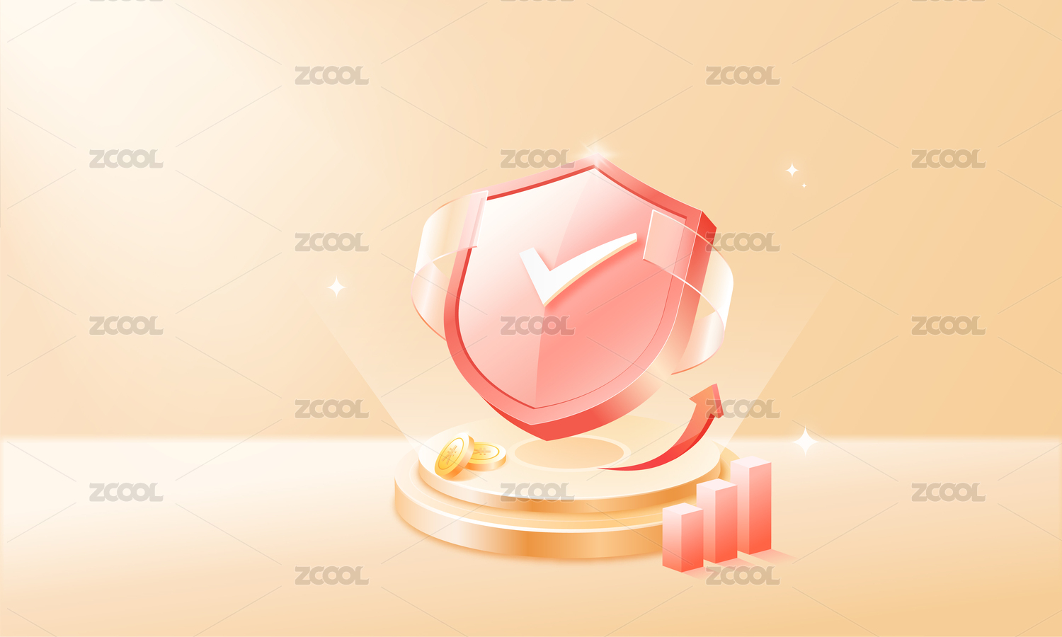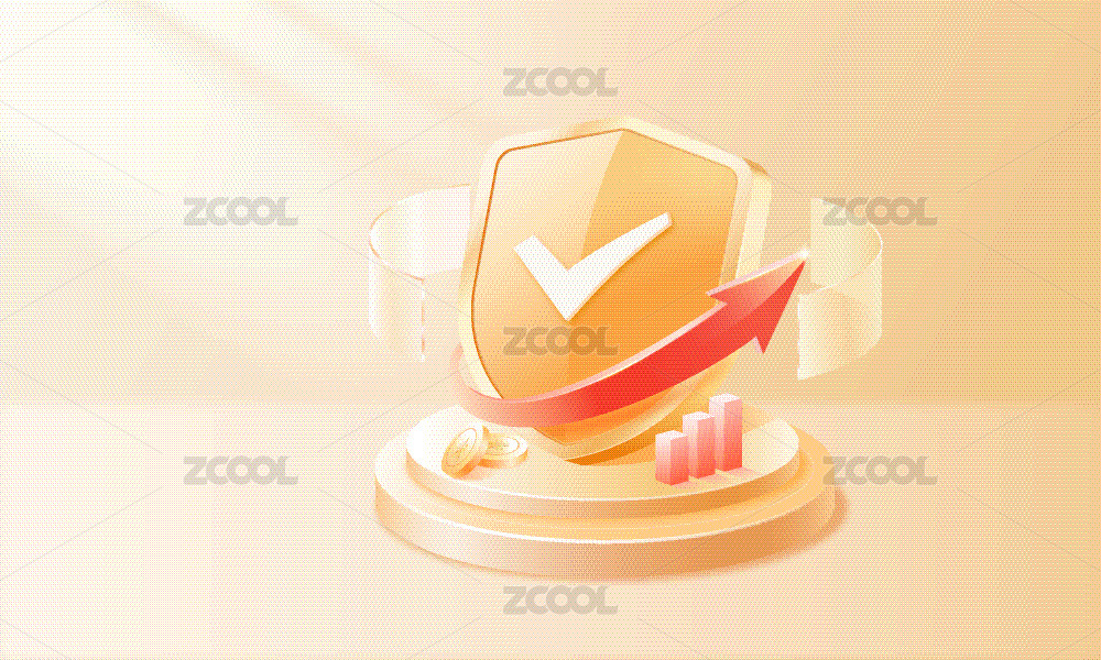 3D金融理財紅盾牌保障安全 紅色上漲箭頭