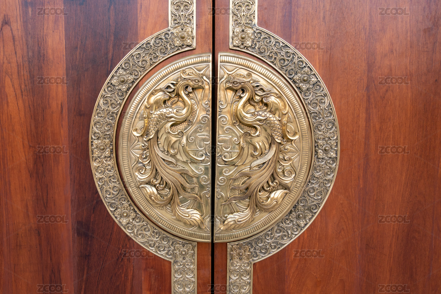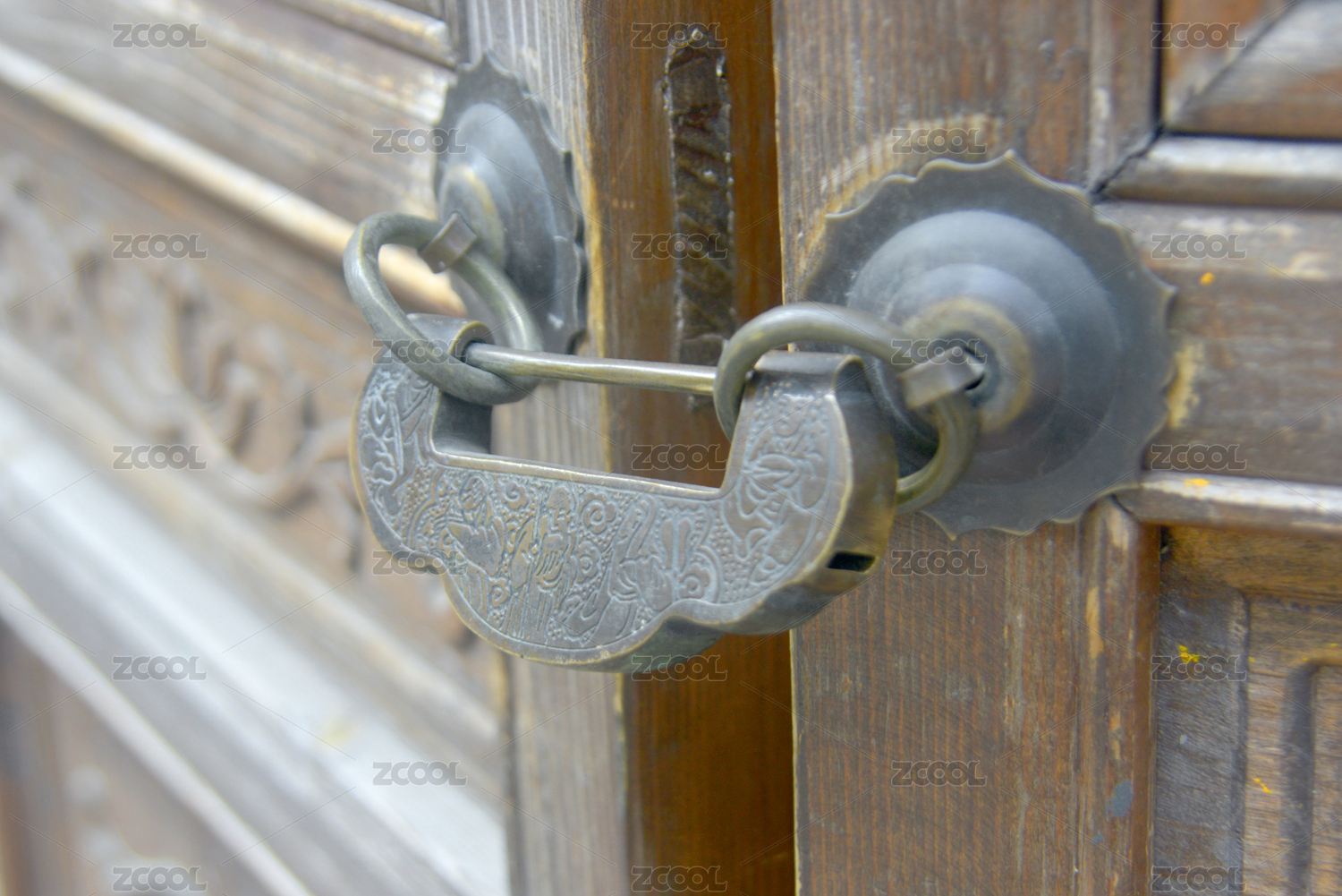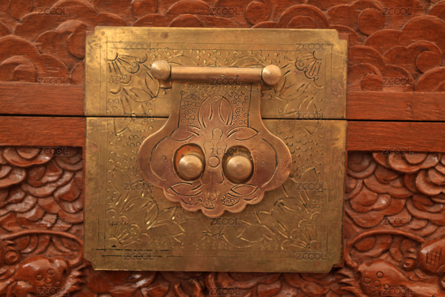 古銅鎖扣與雕花木紋