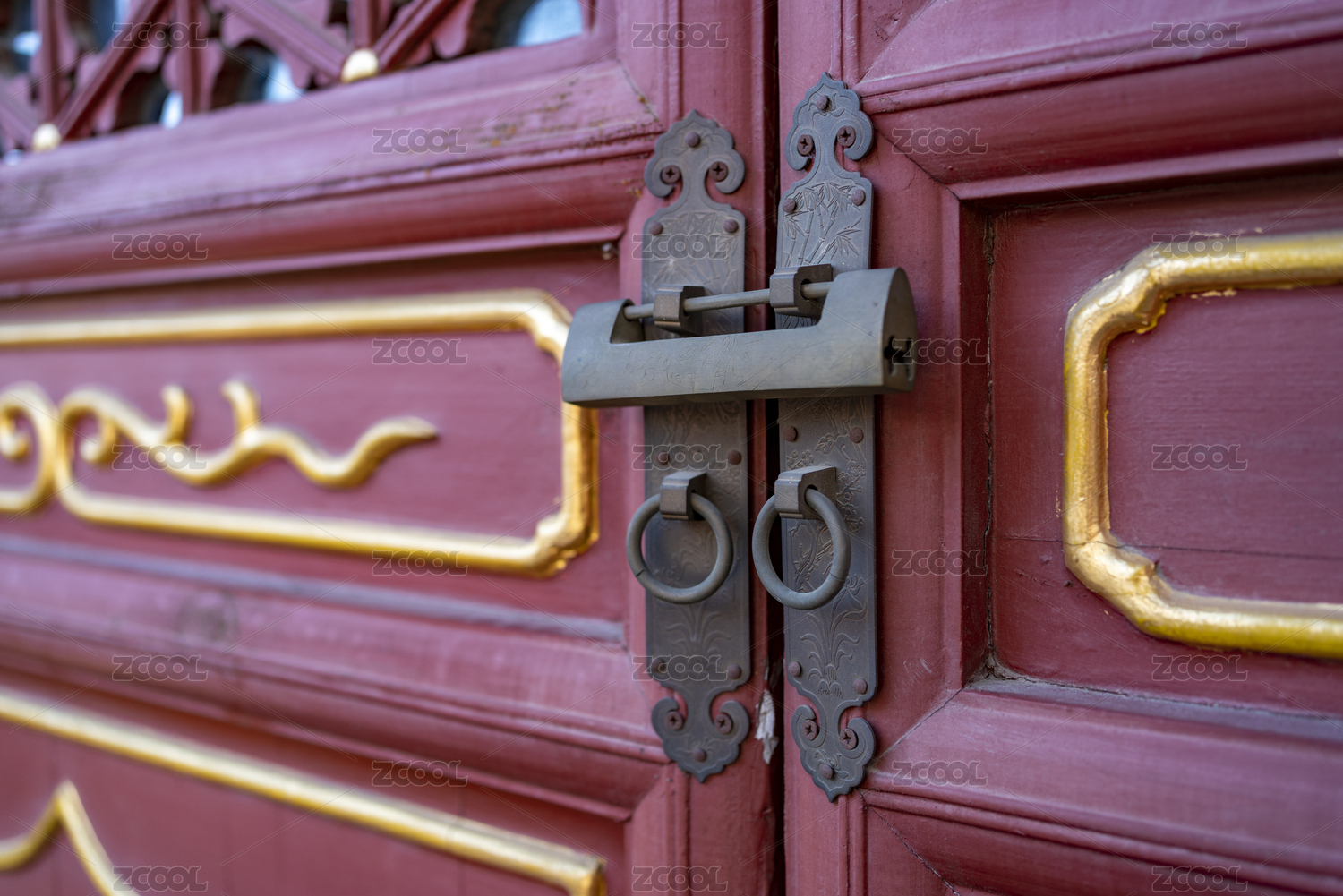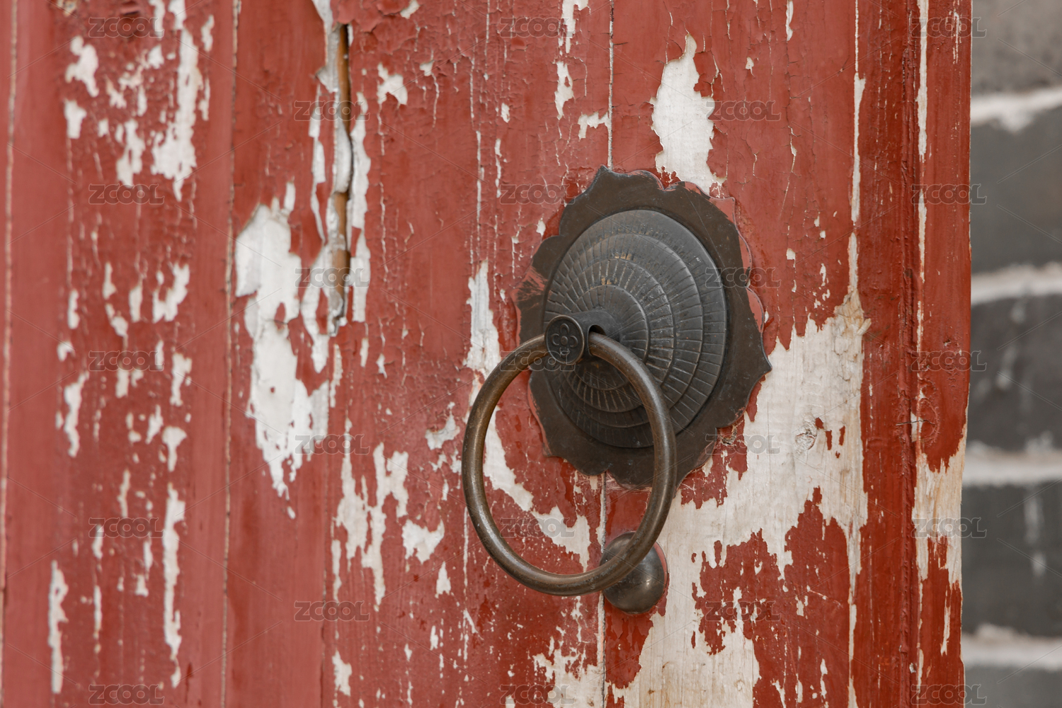 紅色大門上的復(fù)古銅質(zhì)門扣
