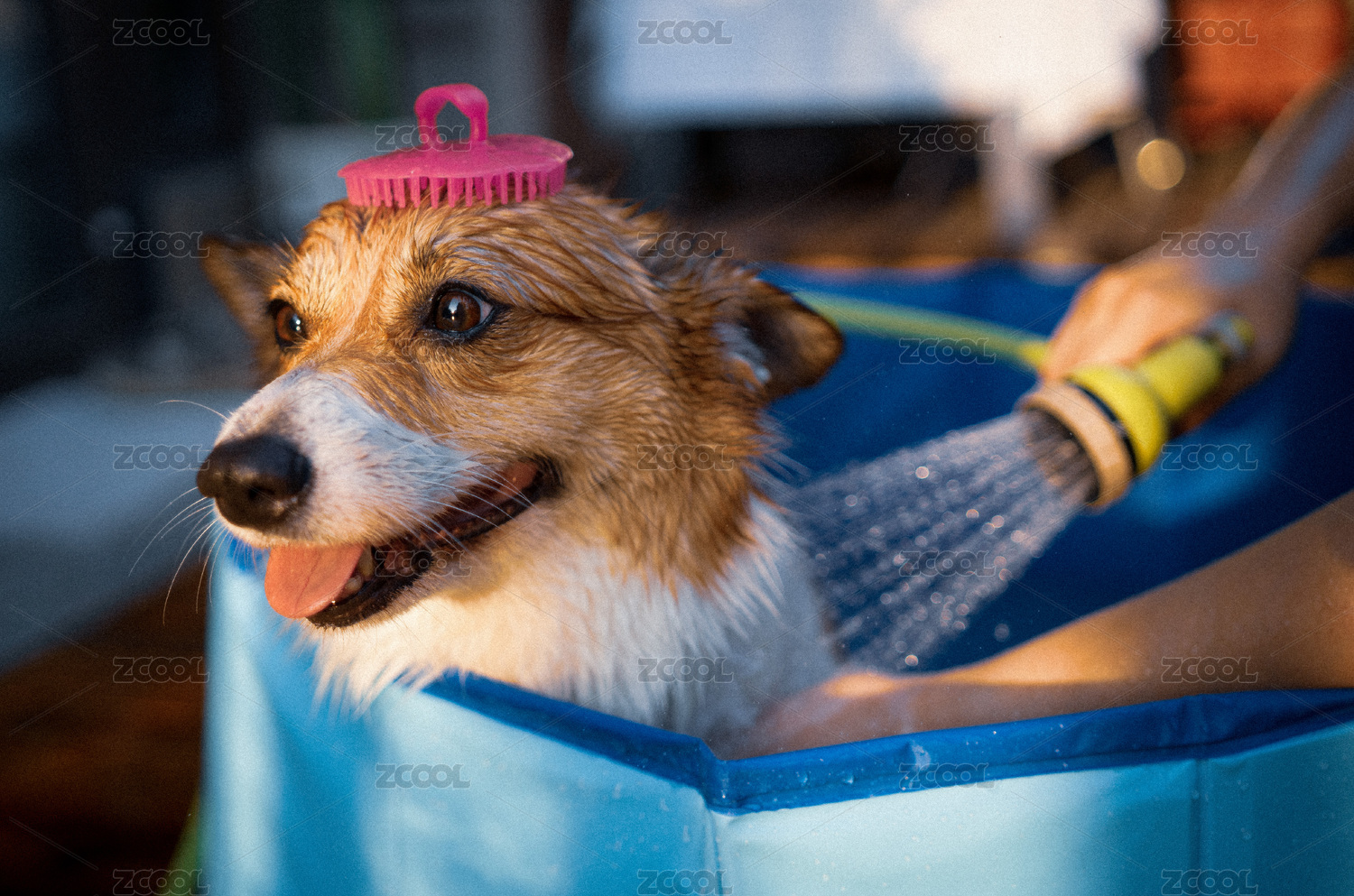 主人在院子里給柯基狗狗洗澡
