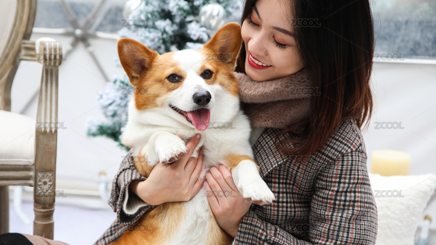 一只柯基寵物小狗被主人抱在懷里