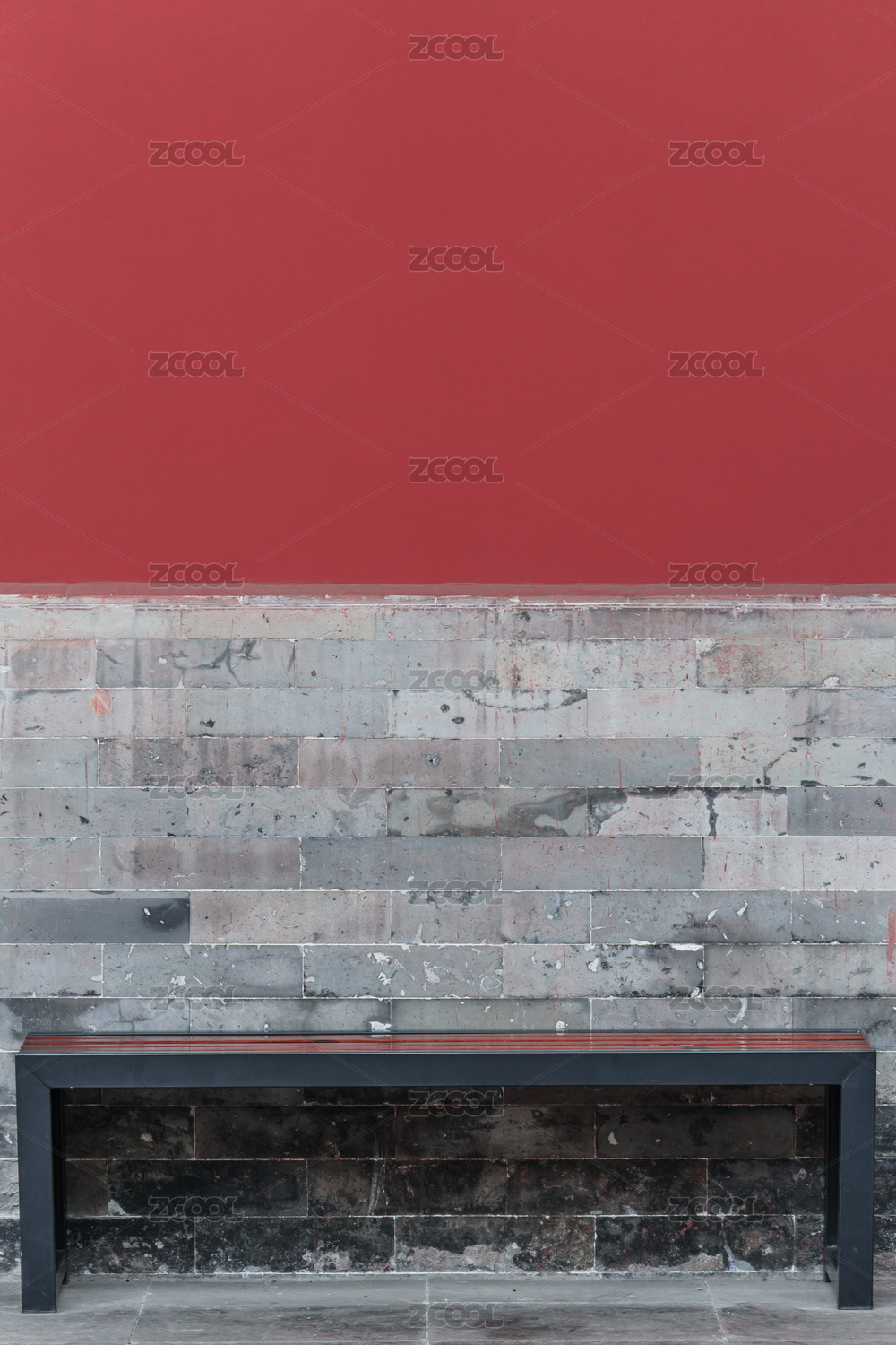古建筑紅墻和磚墻拼接和長椅