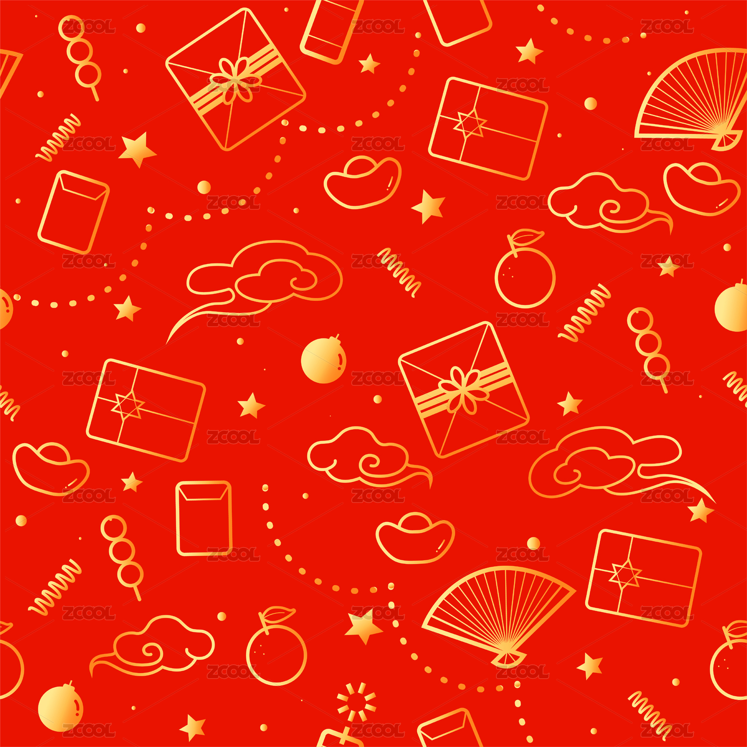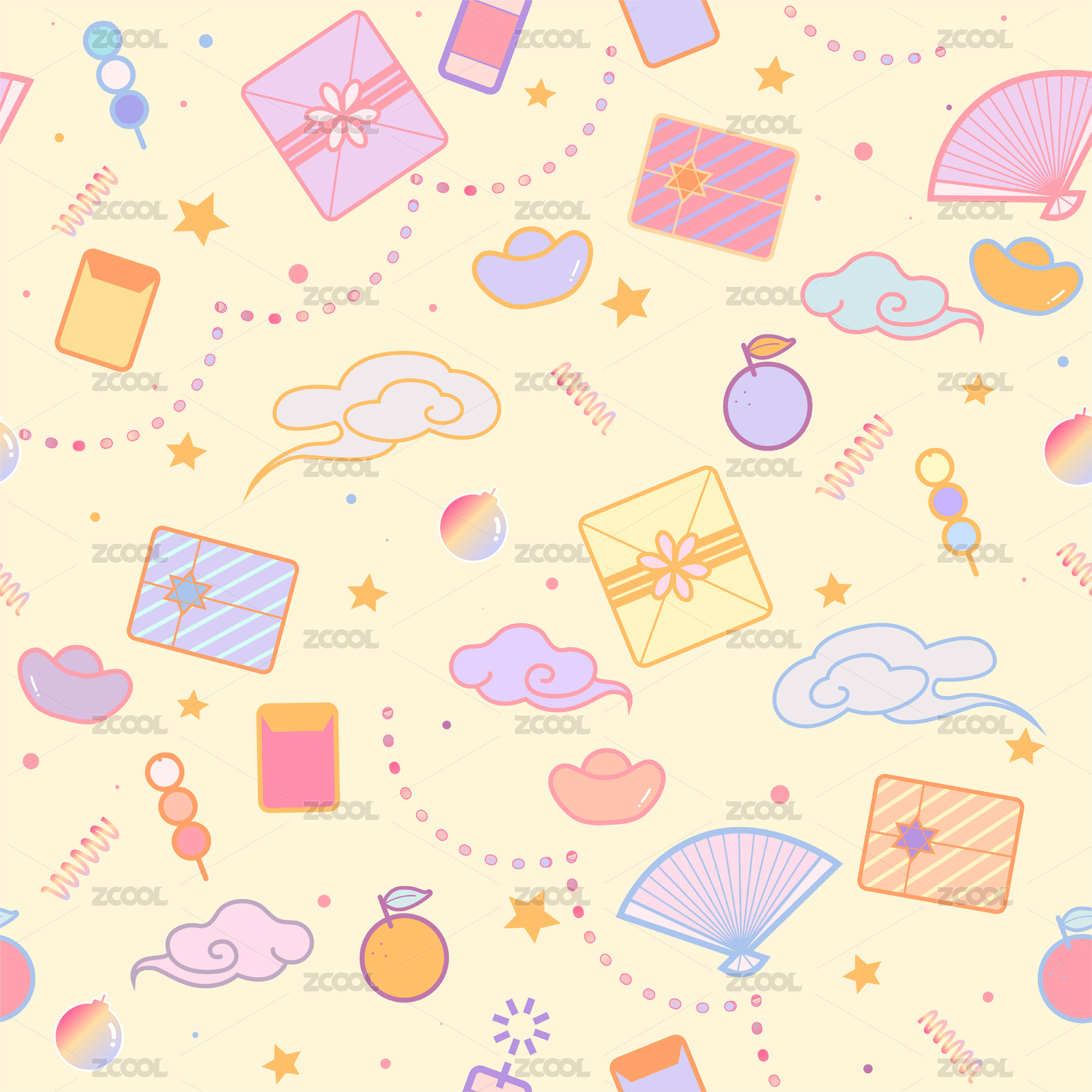 無縫拼接祥云紅包元寶鞭炮可愛彩色漸變元素