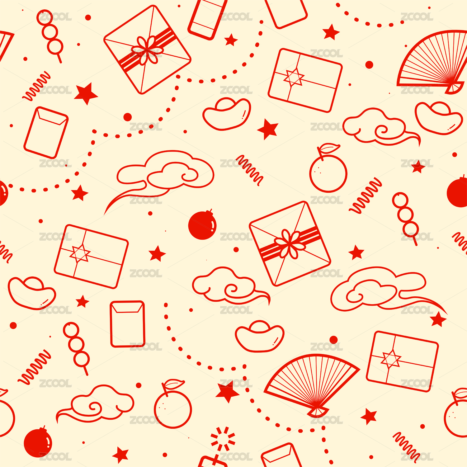 無縫拼接禮物祥云紅包元寶鞭炮紅色喜慶元素