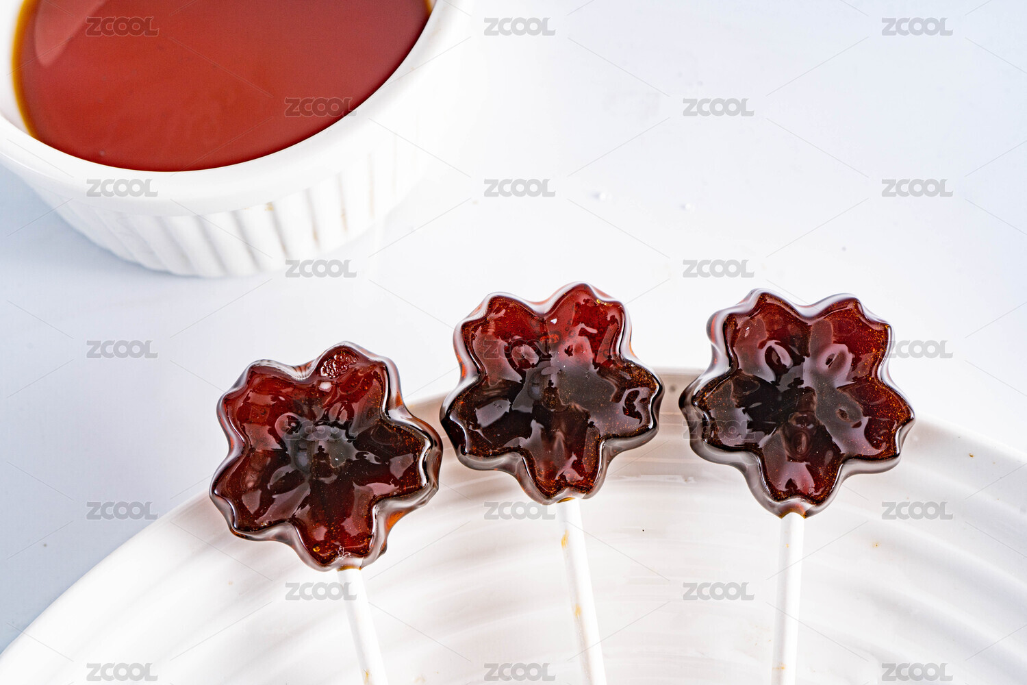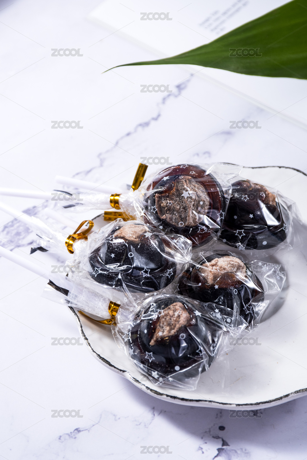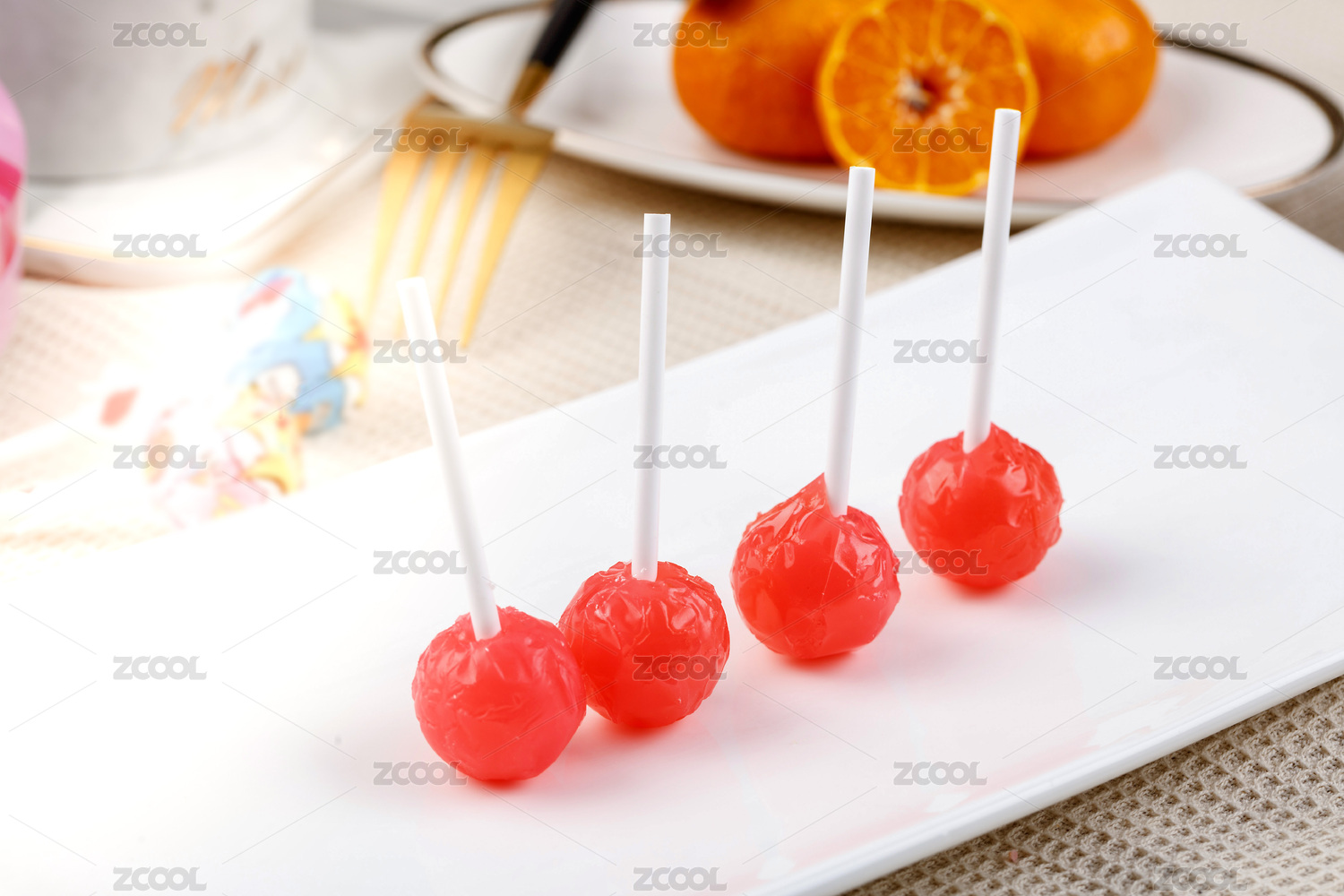 桌面上的盤子里的梅心棒棒糖