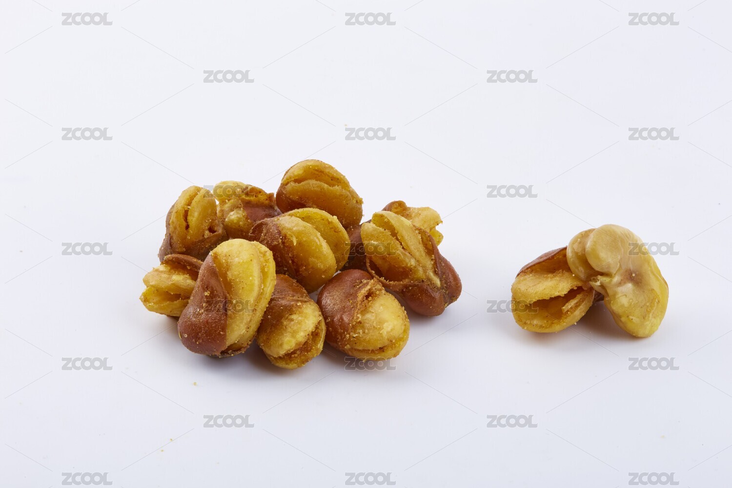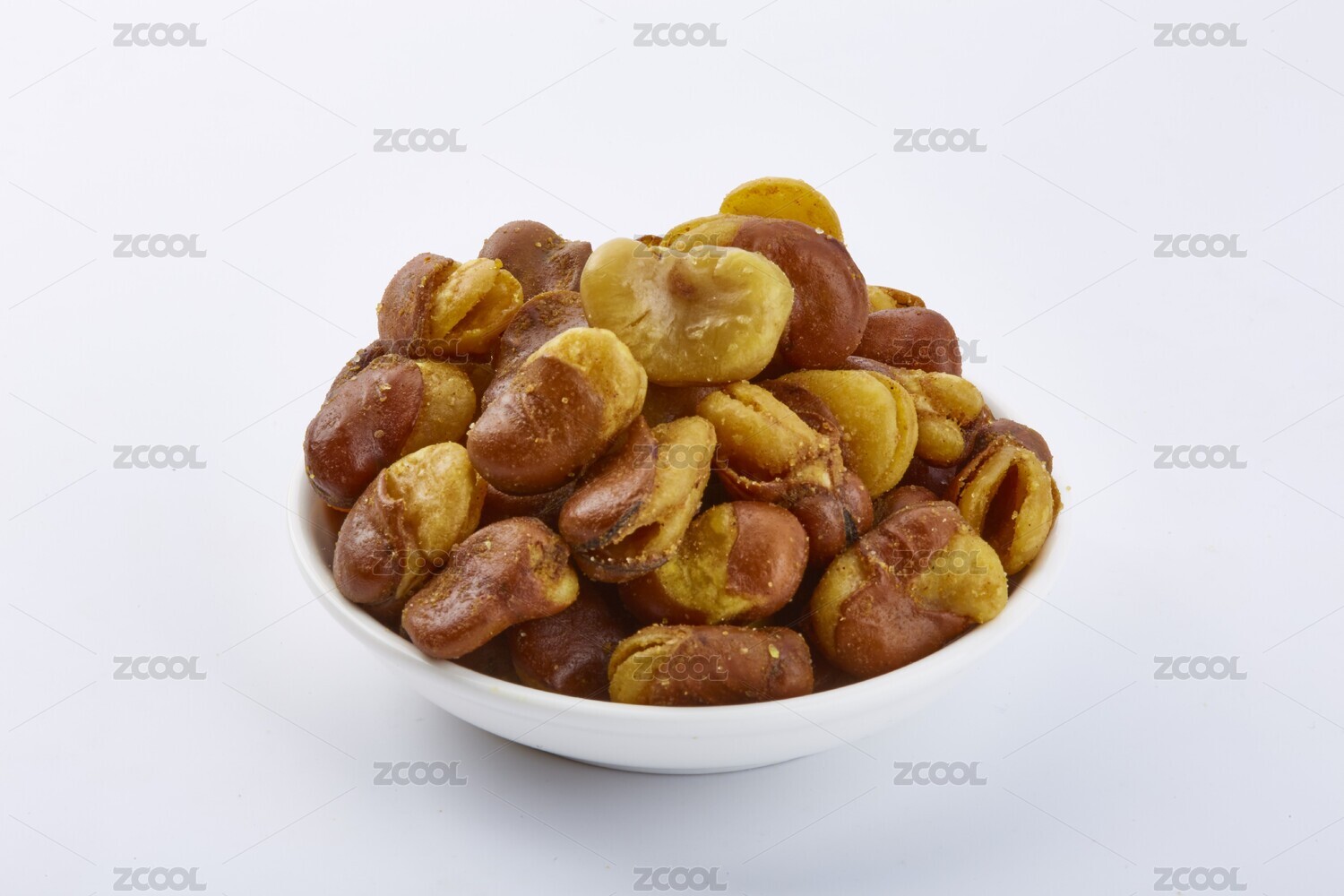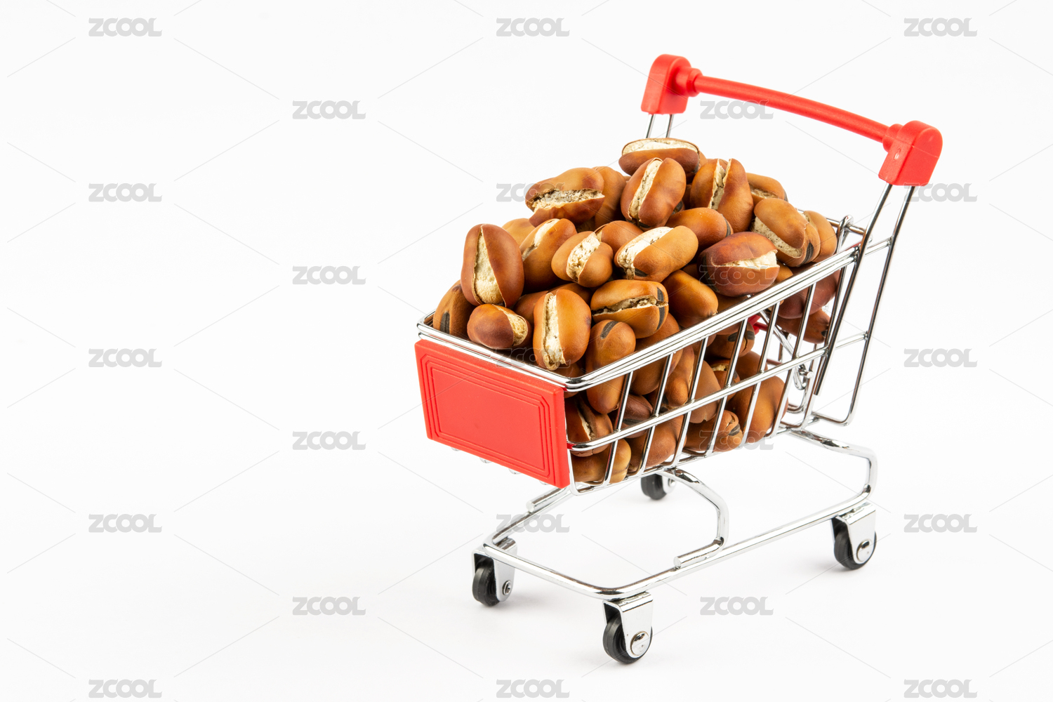 一輛裝滿農(nóng)家干炒蠶豆的購物車,白色背景