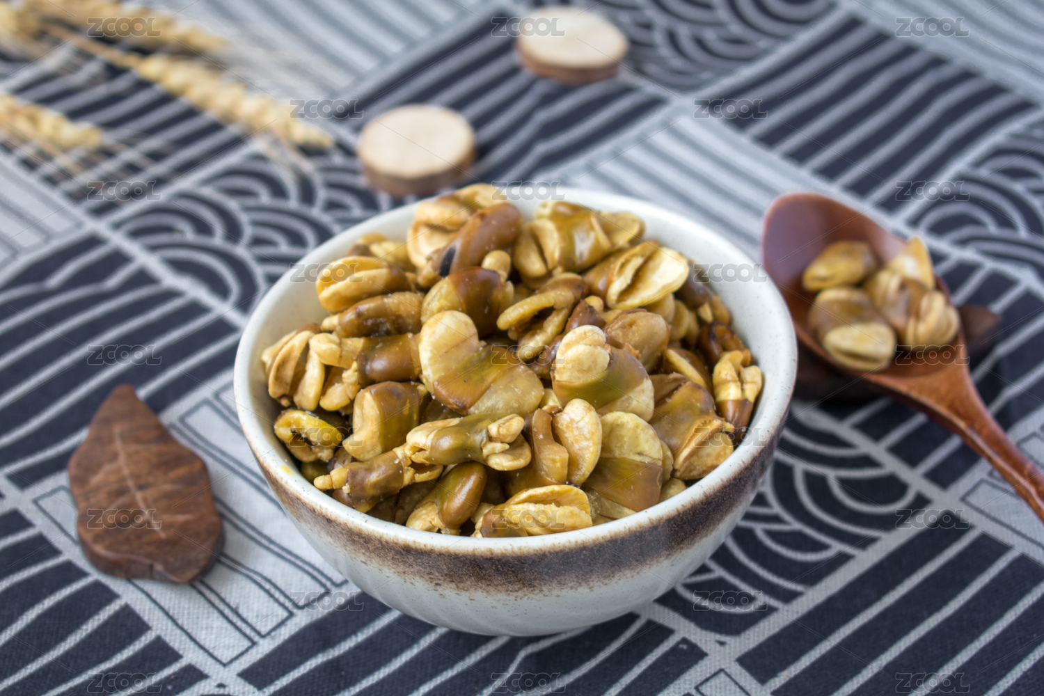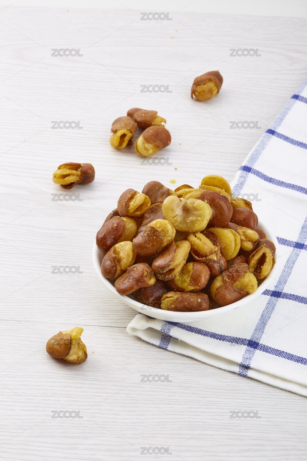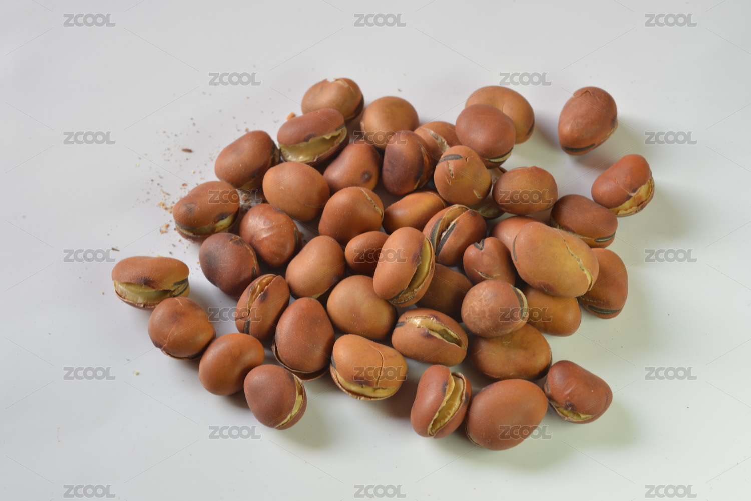 一輛裝滿農(nóng)家干炒蠶豆的購物車,白色背景