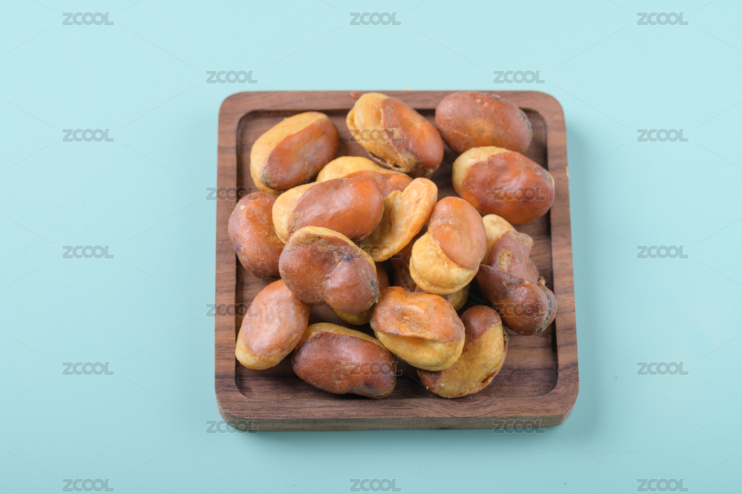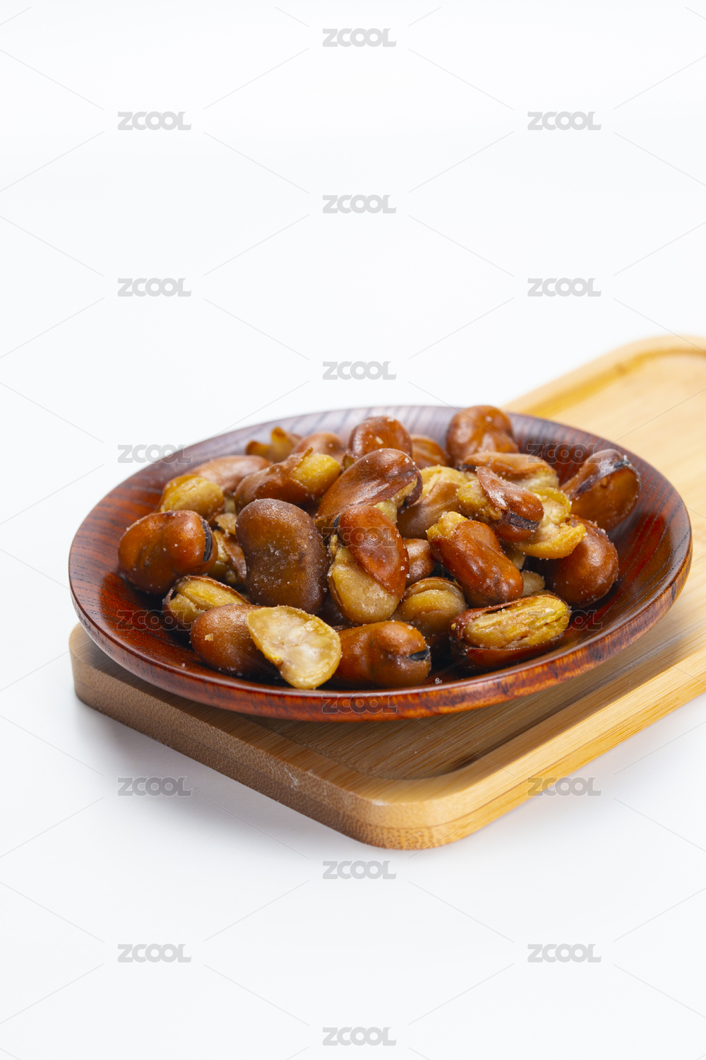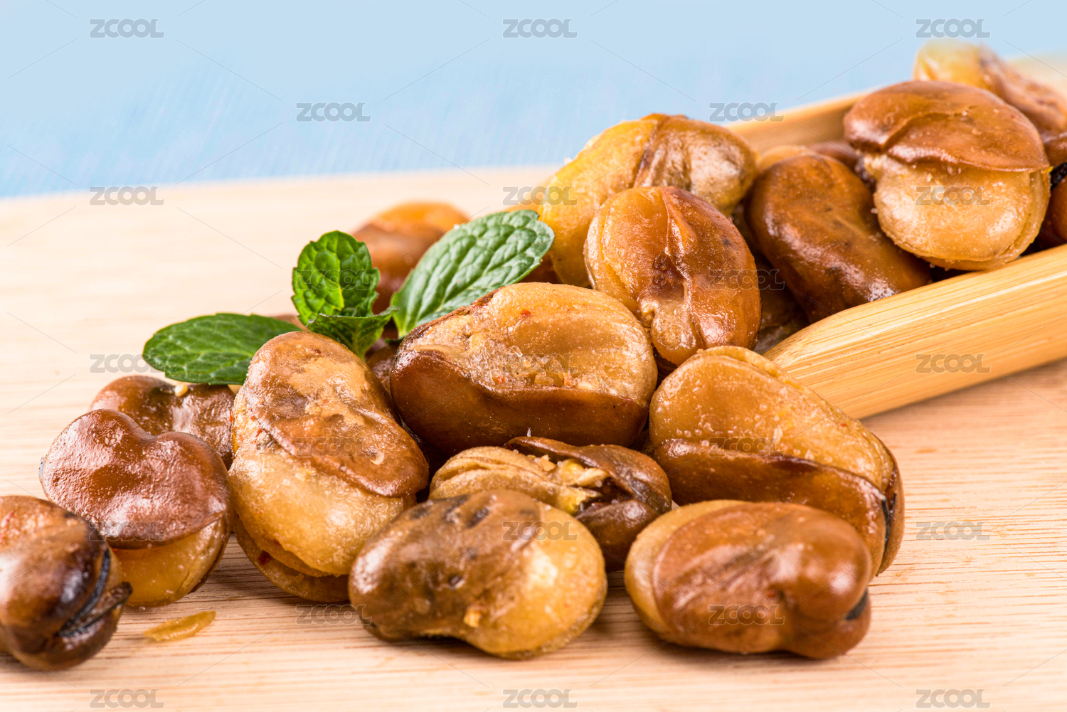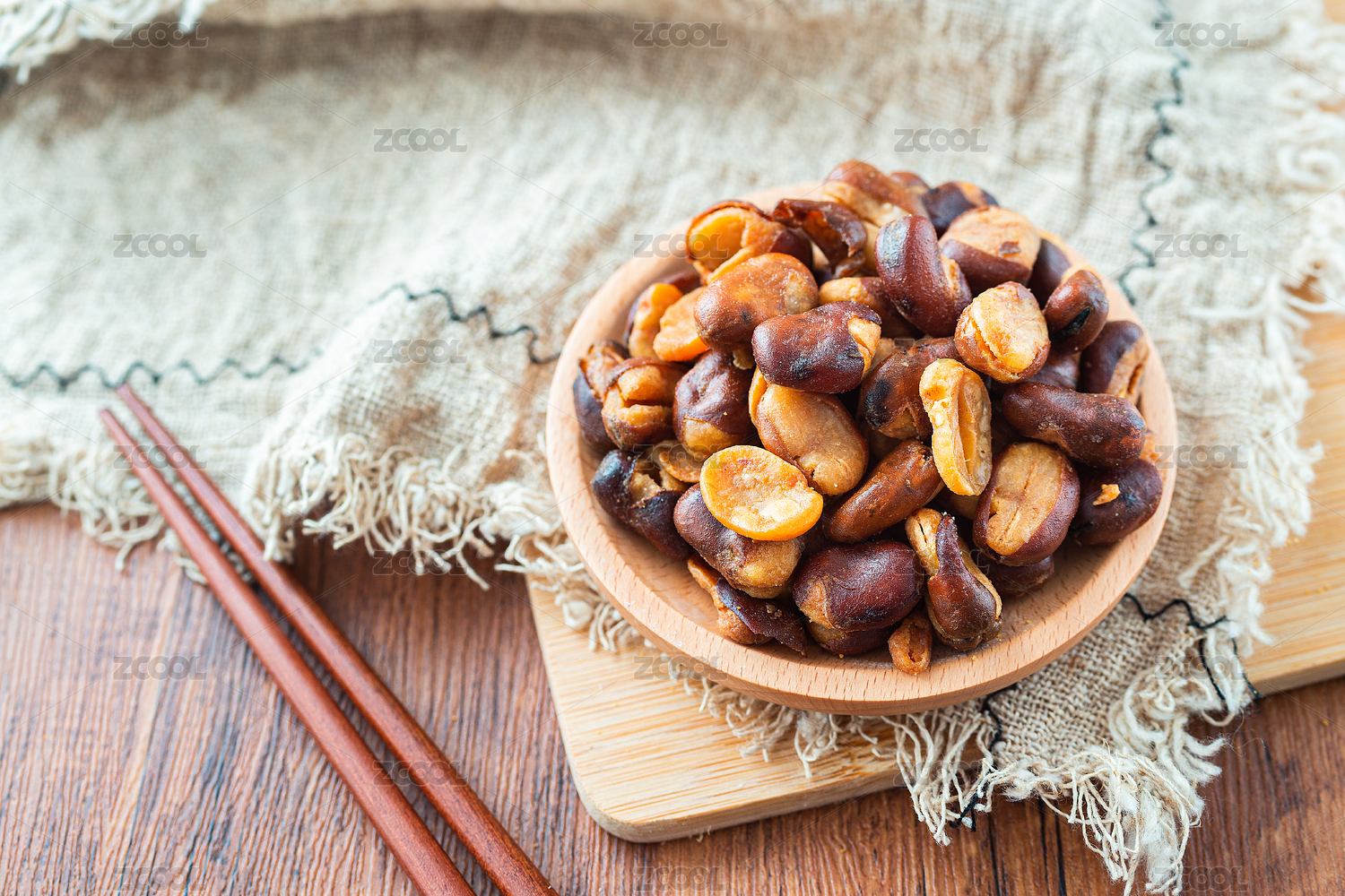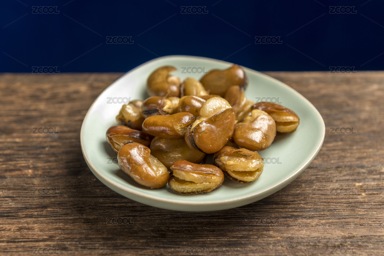 一盤蘭花豆老虎豆油炸蠶豆擺放在木桌面上
