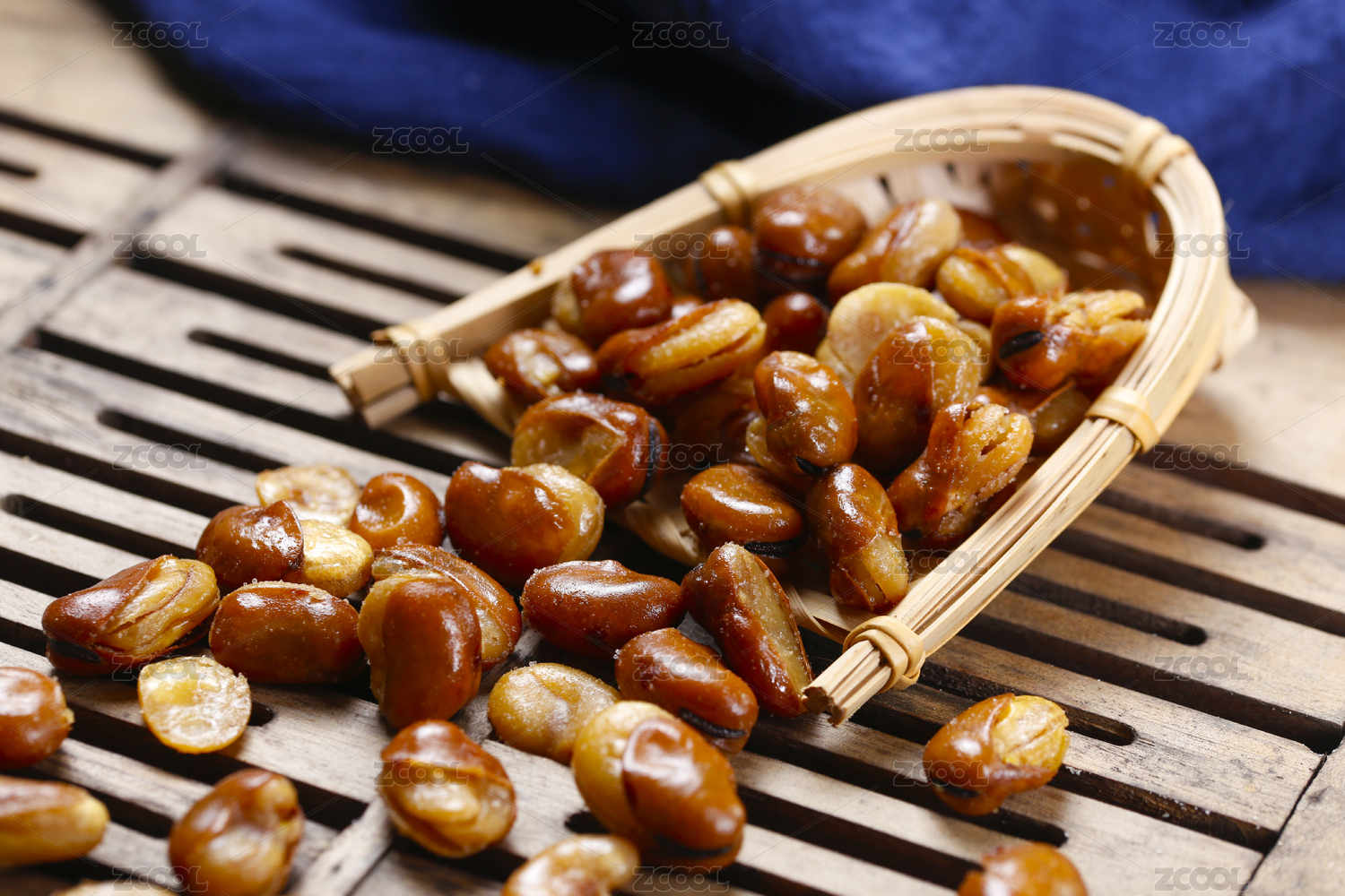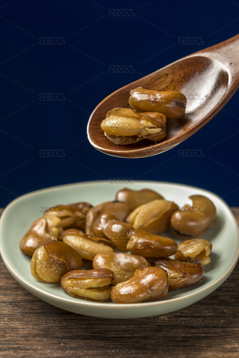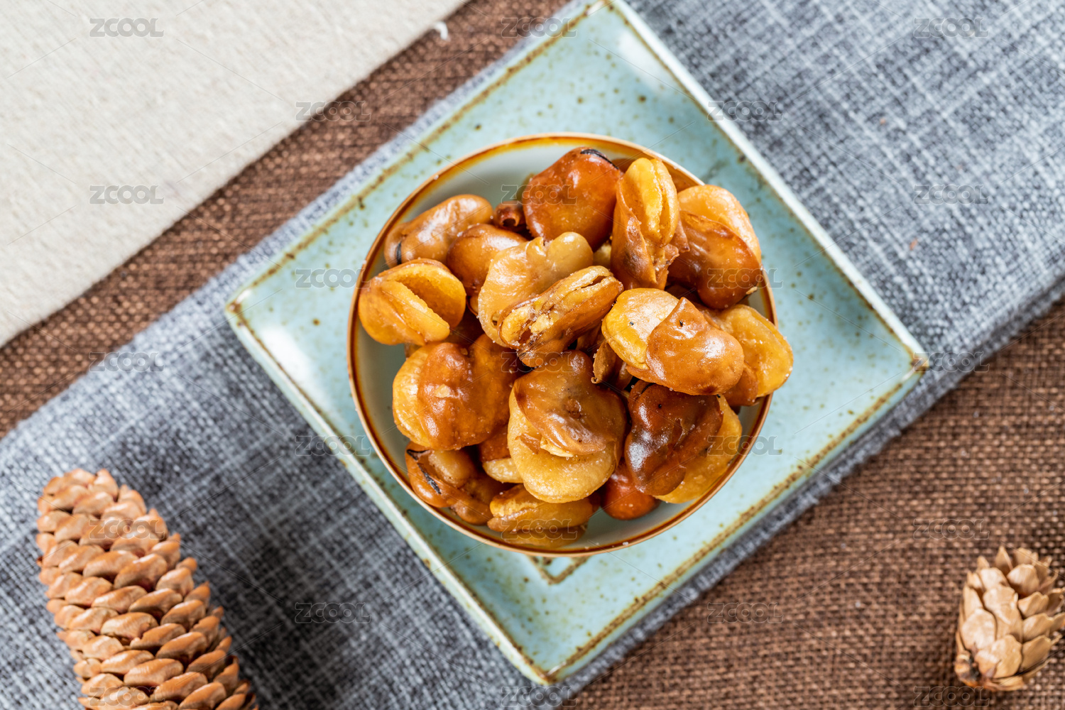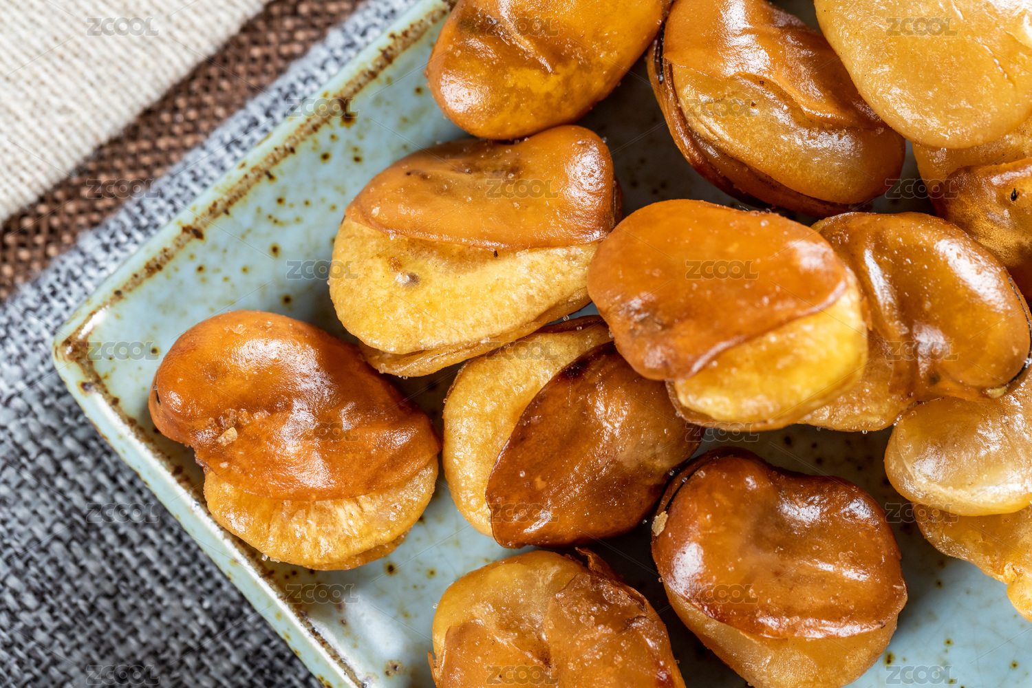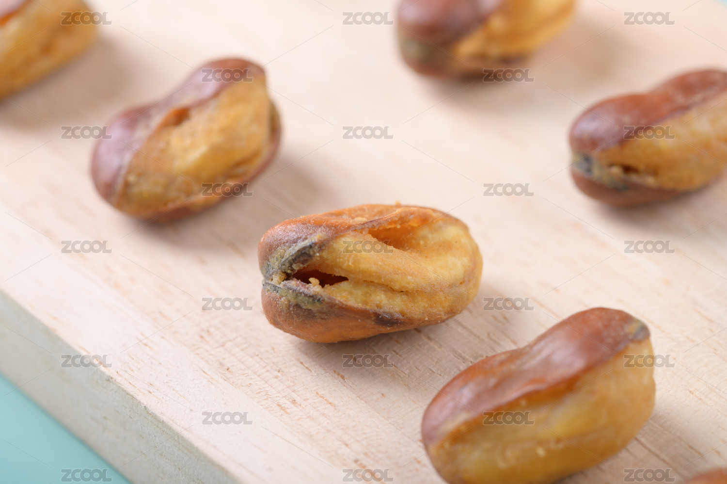 一盤蘭花豆老虎豆油炸蠶豆擺放在木桌面上