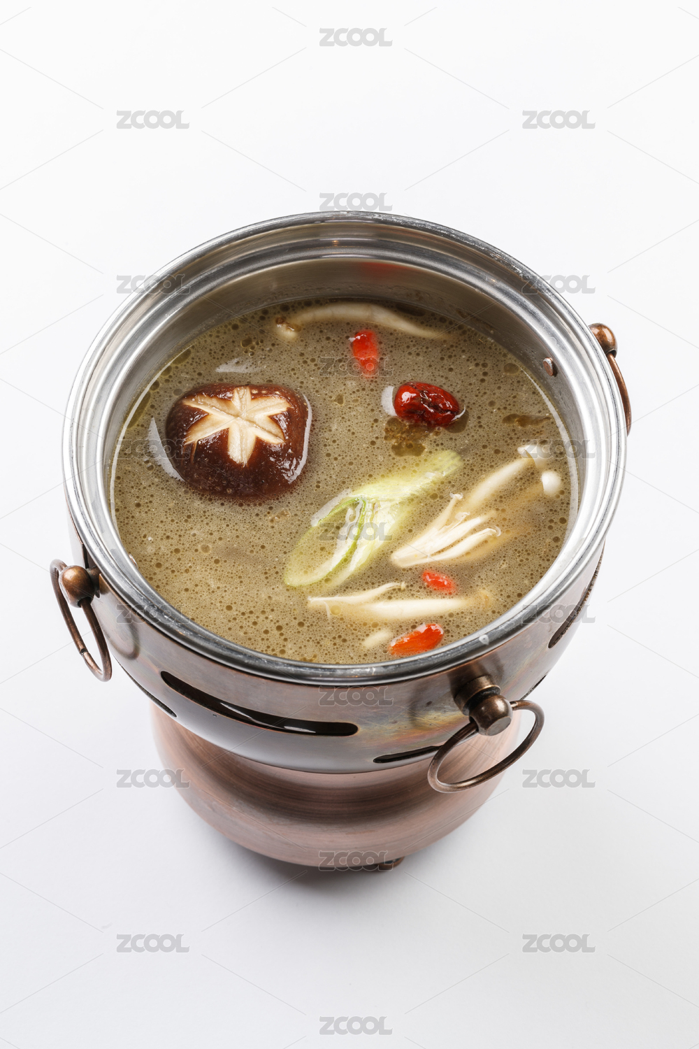白色背景上的小火鍋裝的菌湯鍋底
