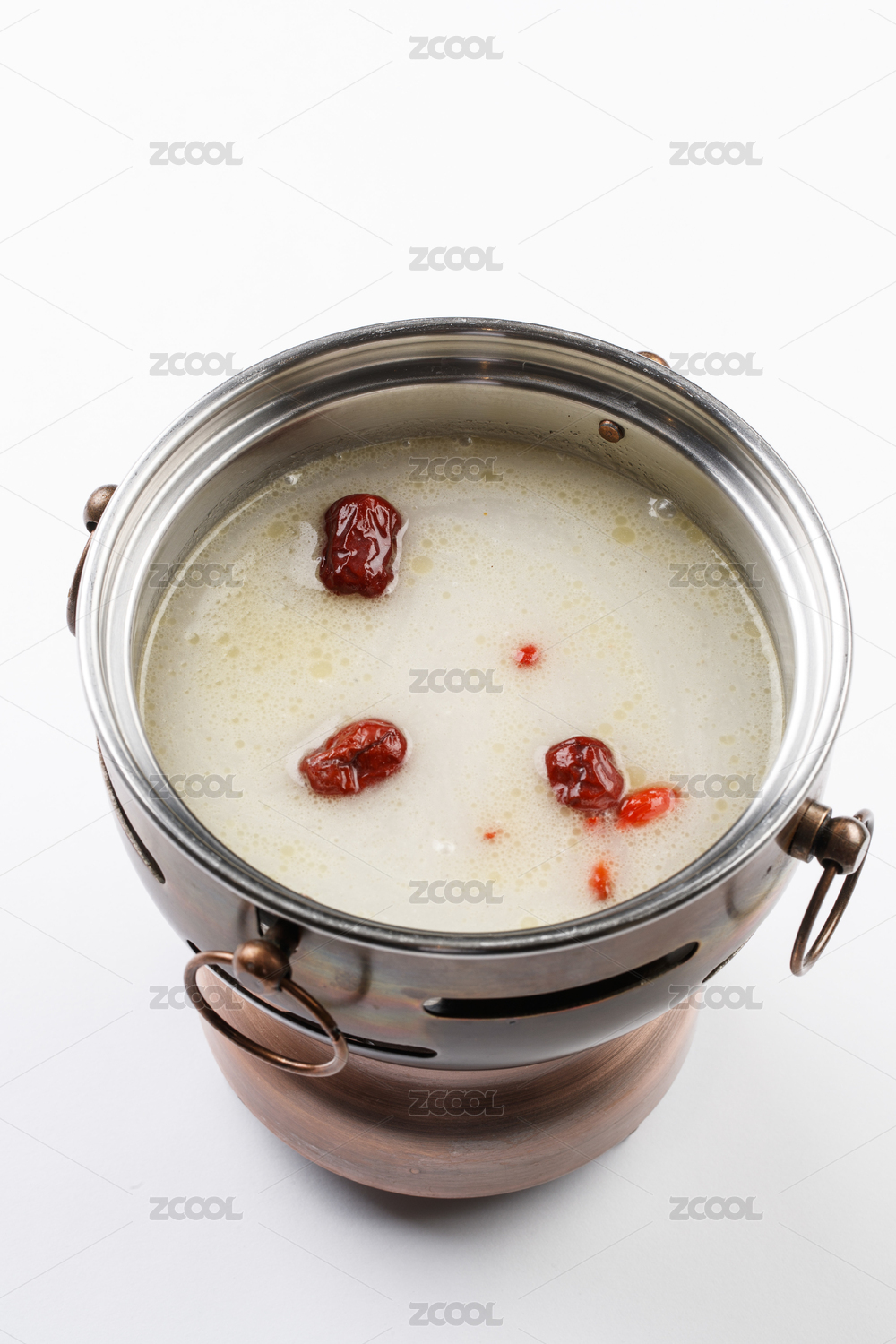 白色背景上的小火鍋裝的大骨奶湯鍋底