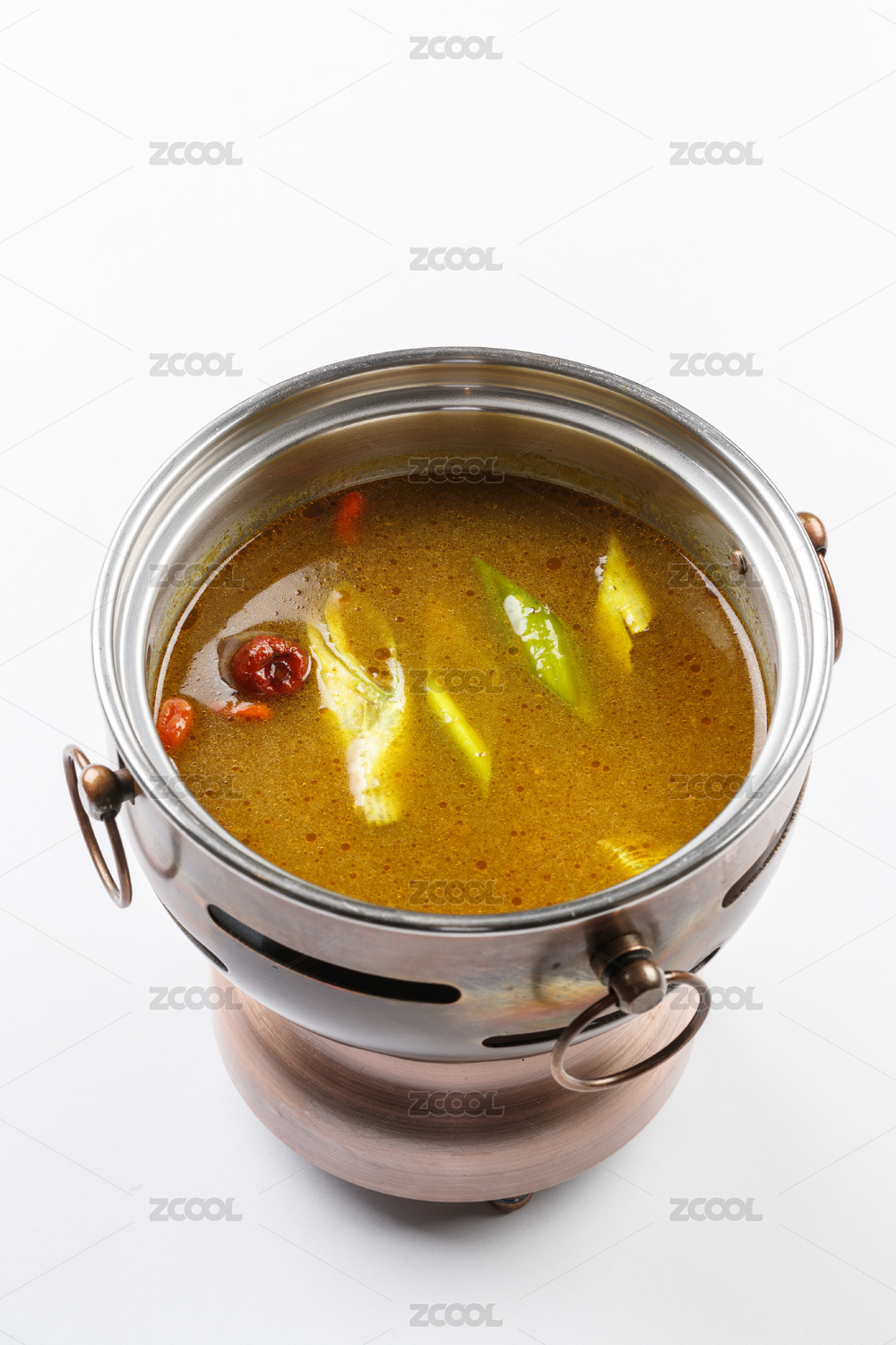 白色背景上的小火鍋裝的清湯鍋底