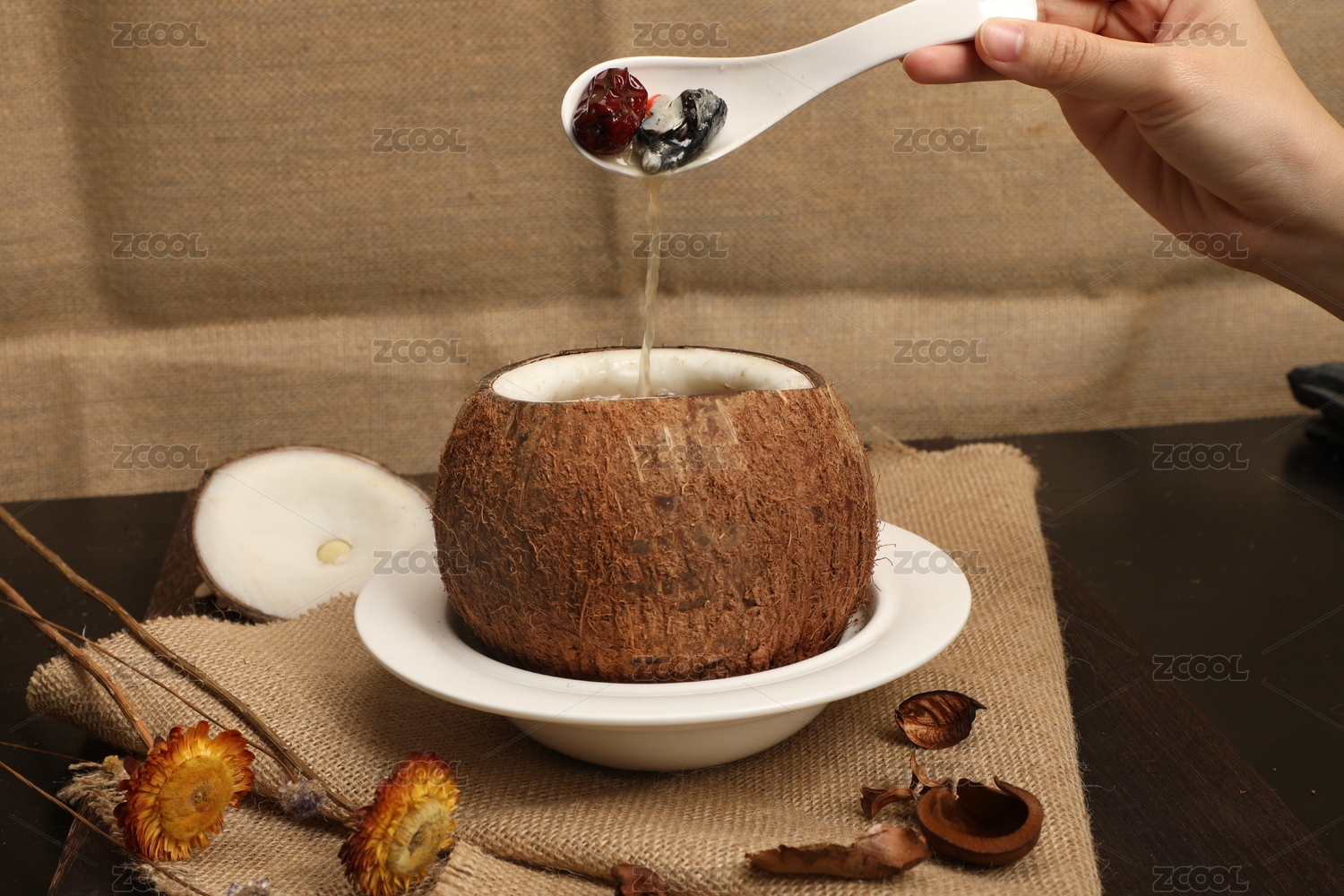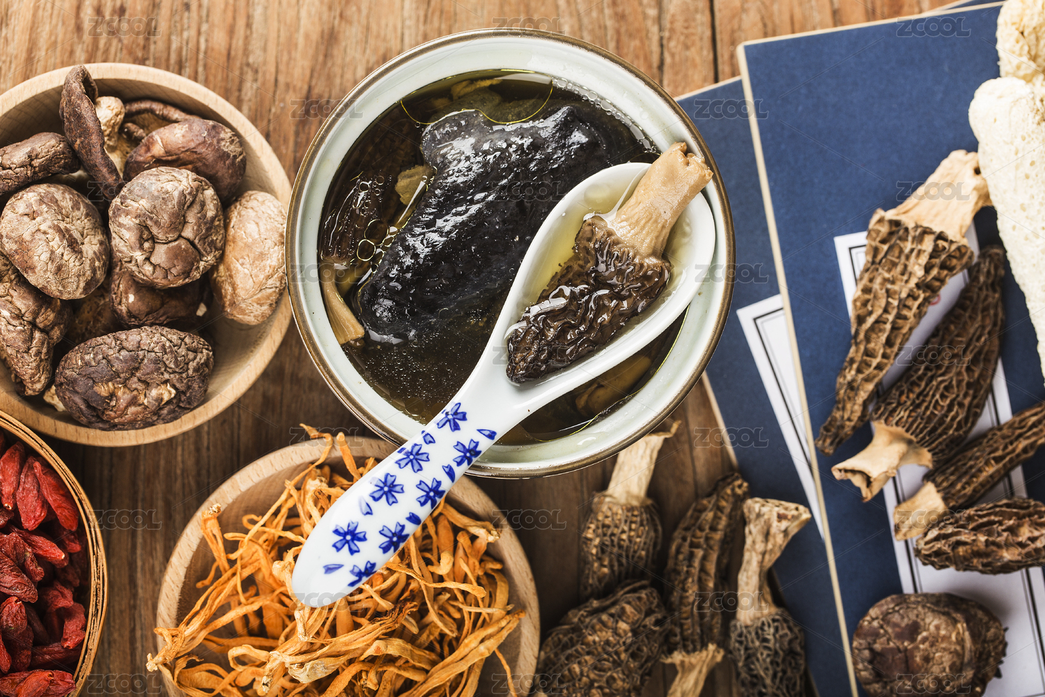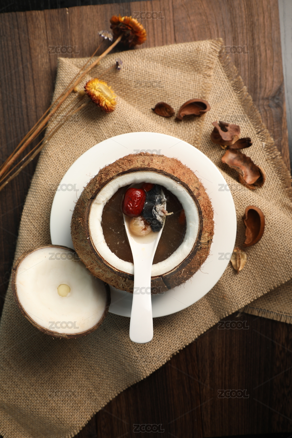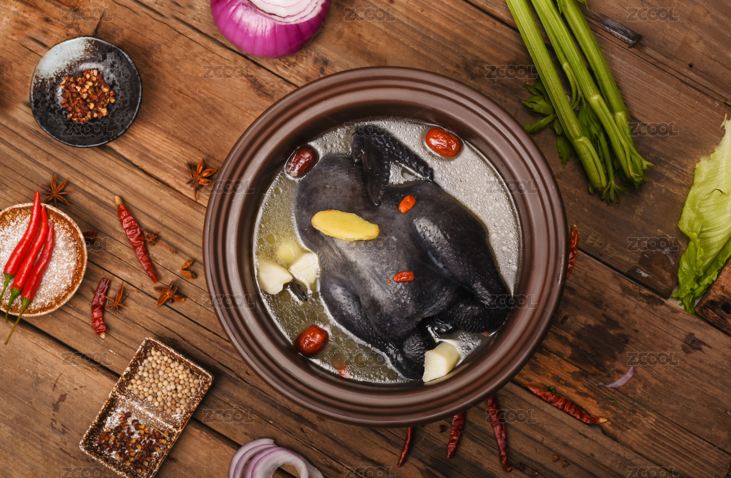 木桌背景營養(yǎng)燉盅人參紅棗烏雞湯