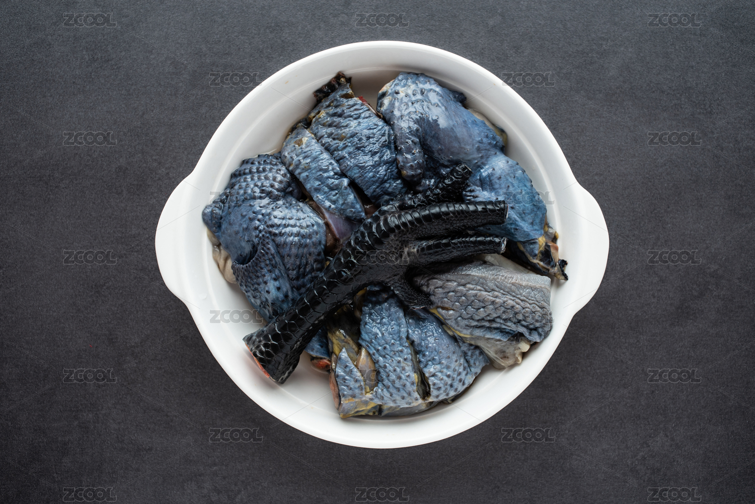 裝在黑色盤子里的一只新鮮烏雞