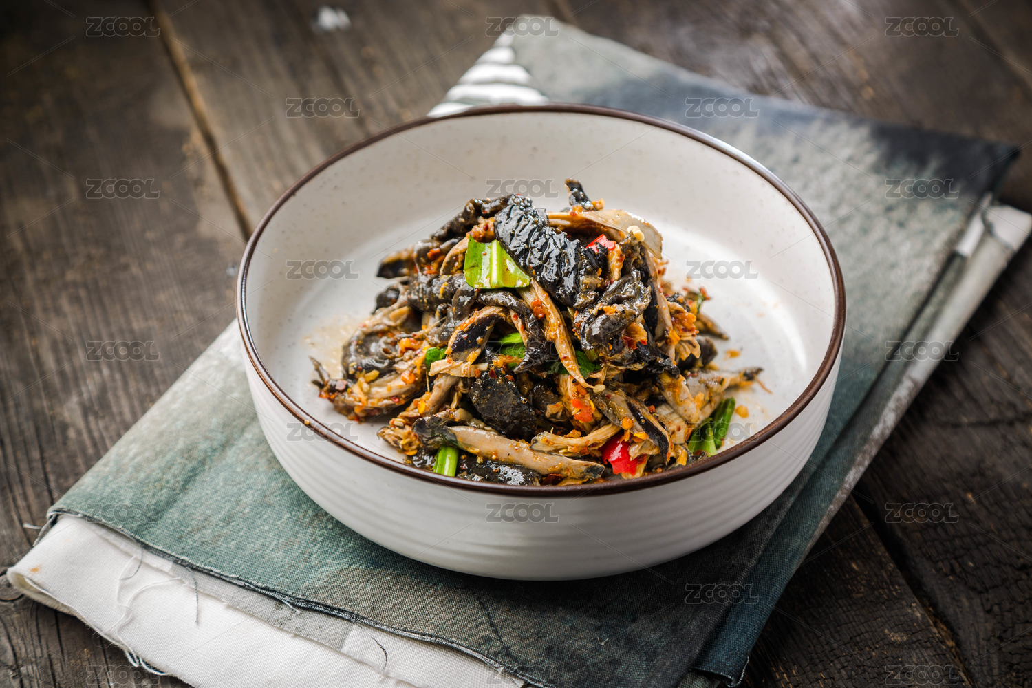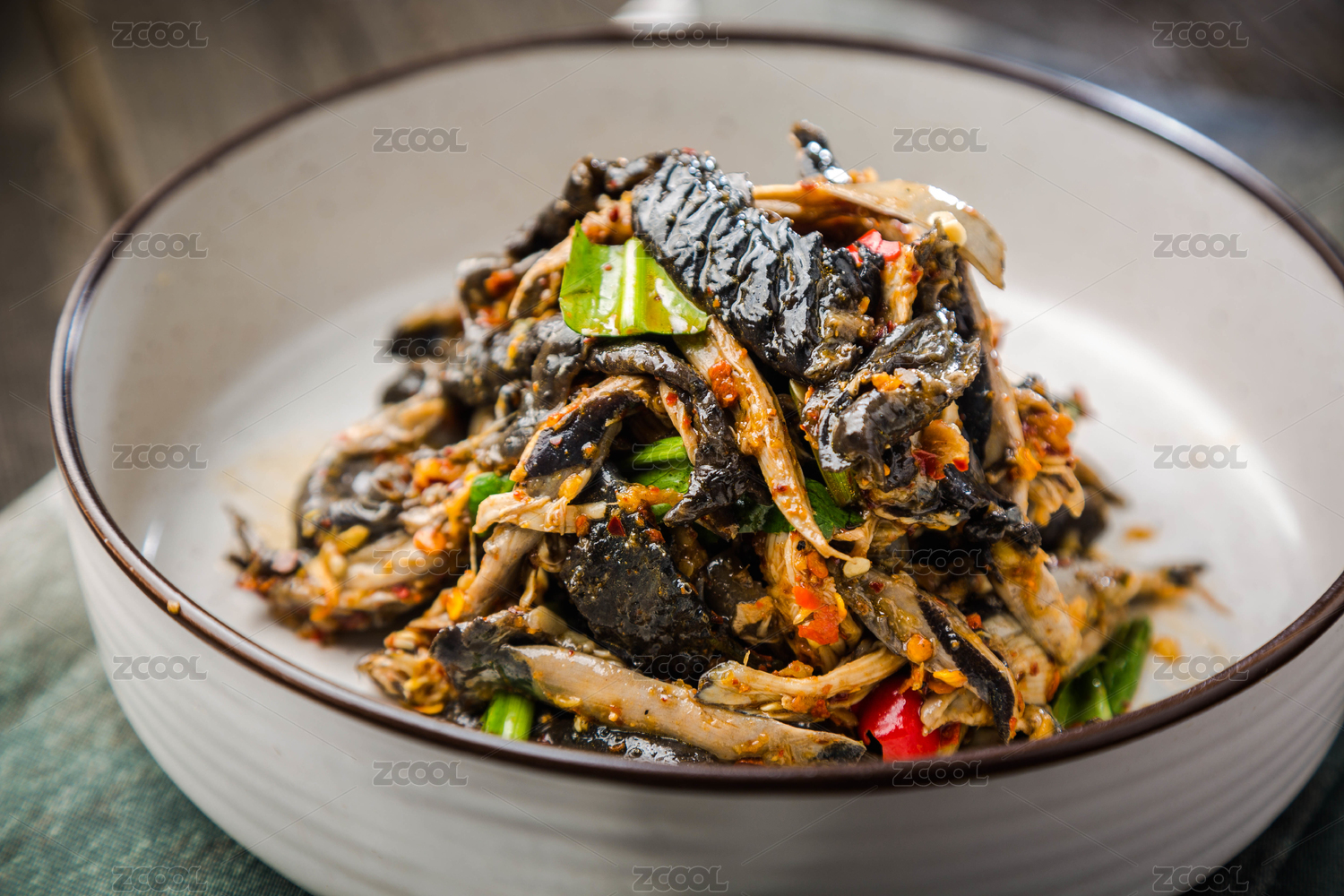 藍(lán)色桌布上一碗美味的烏雞湯