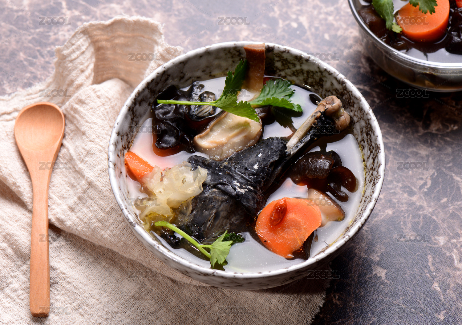 淺色餐布上盛放的滋補烏雞湯