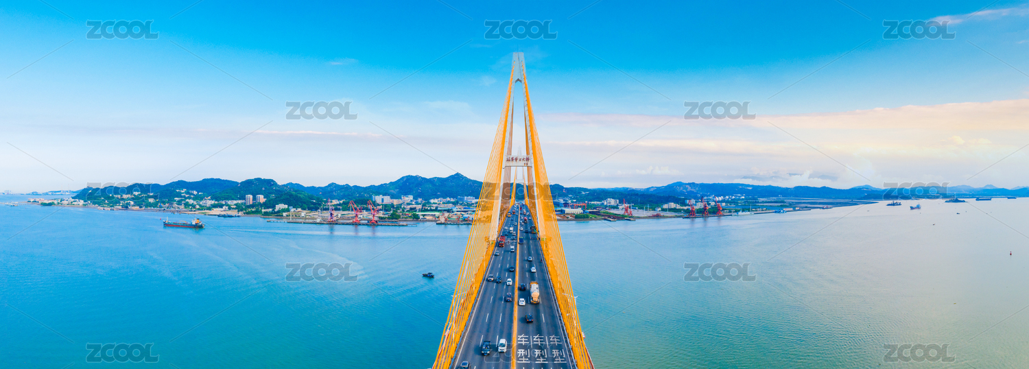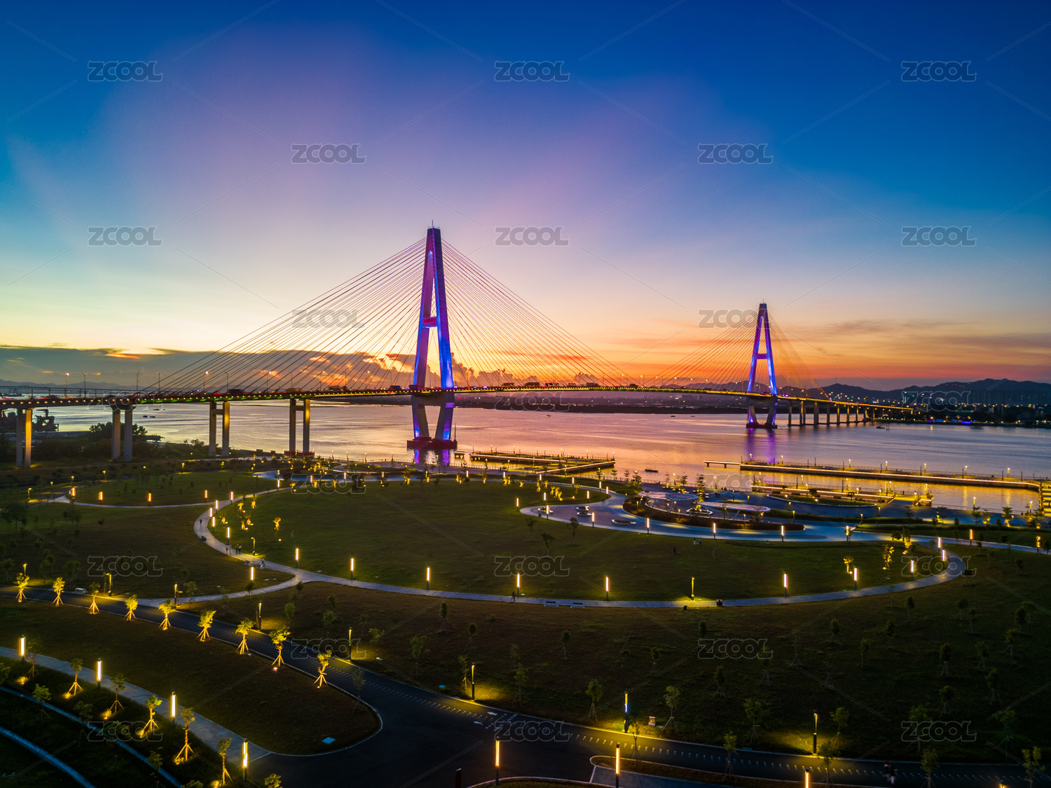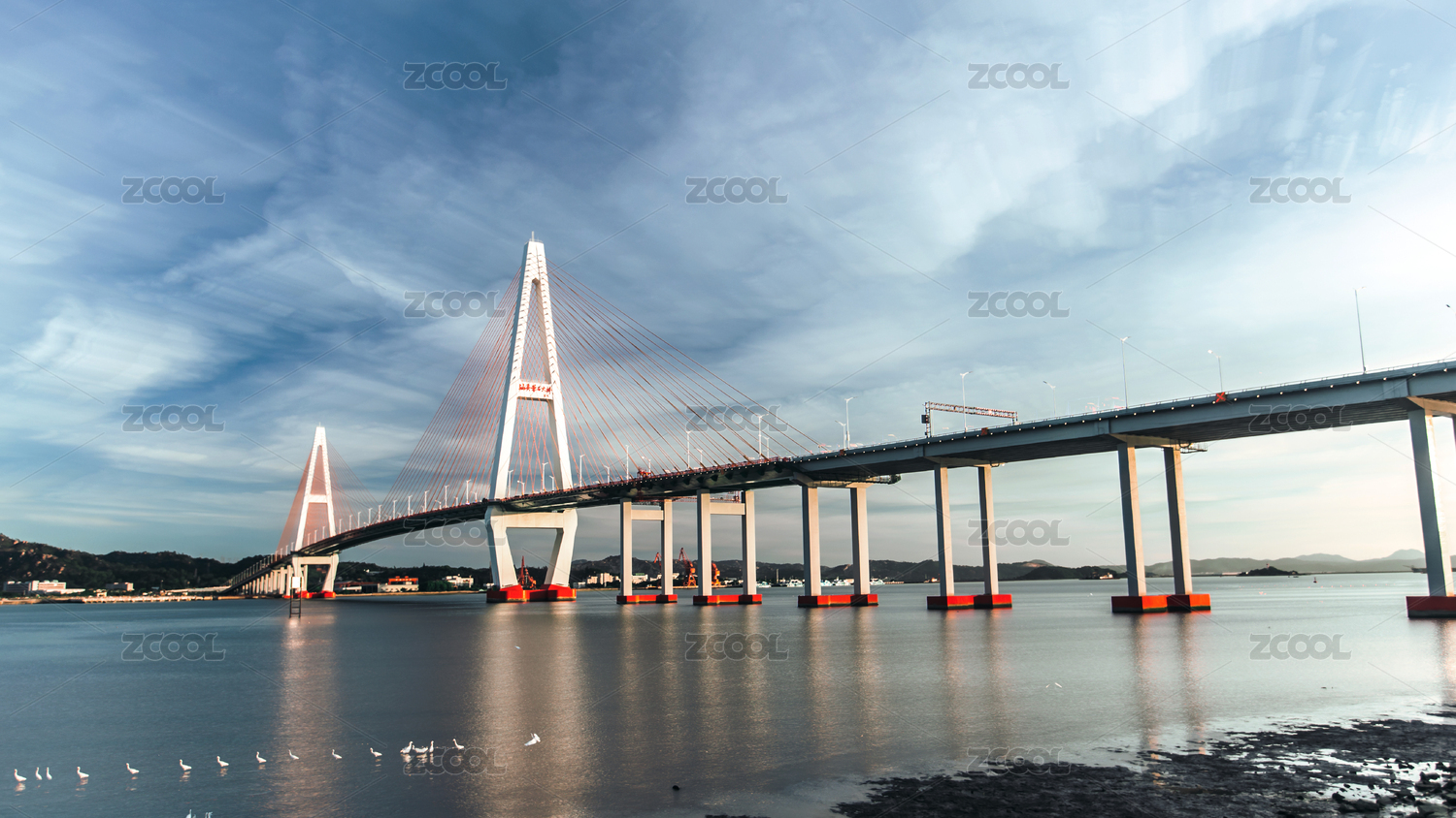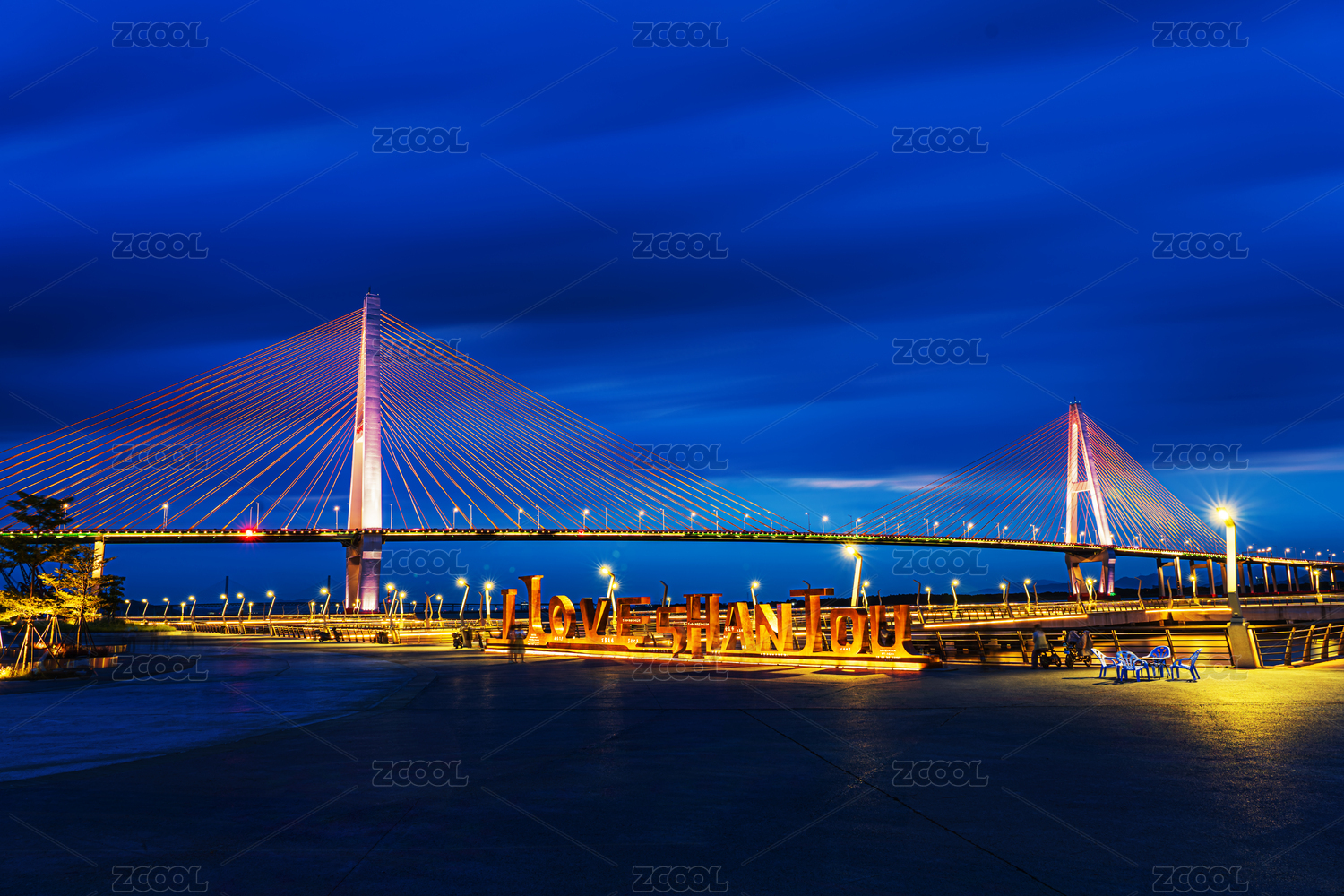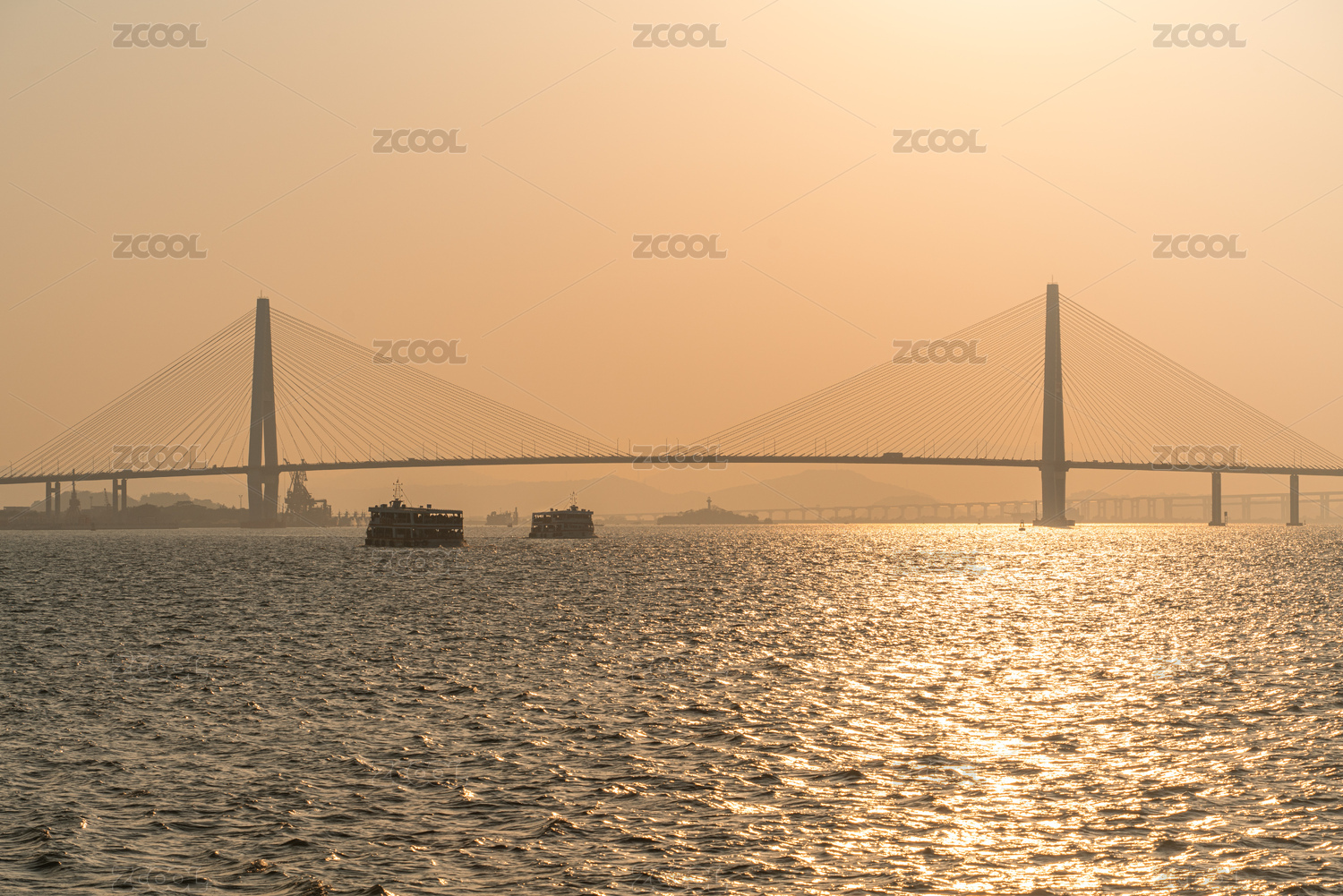 黃昏下的汕頭礐石大橋與內(nèi)海灣上的輪渡