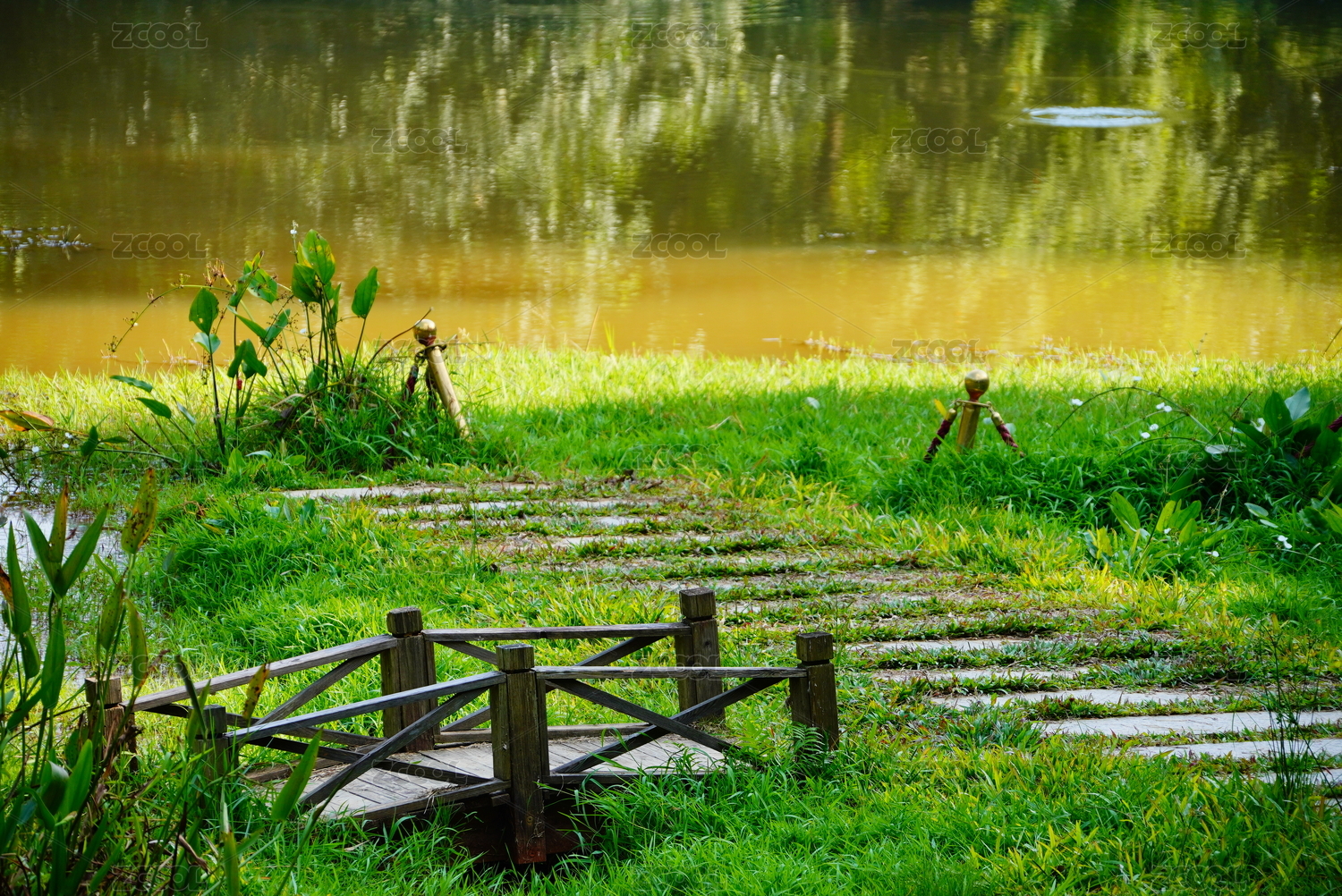 池塘邊的草地與小木橋