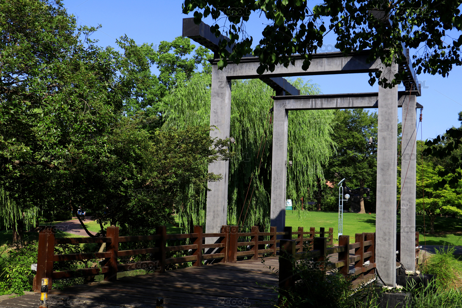 連接綠蔭與草坪的門架和木橋