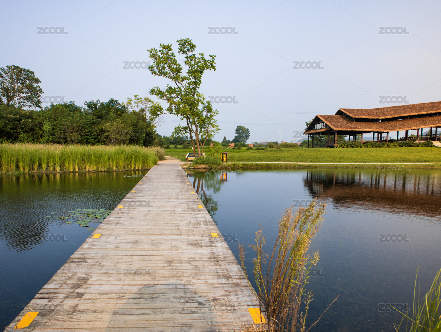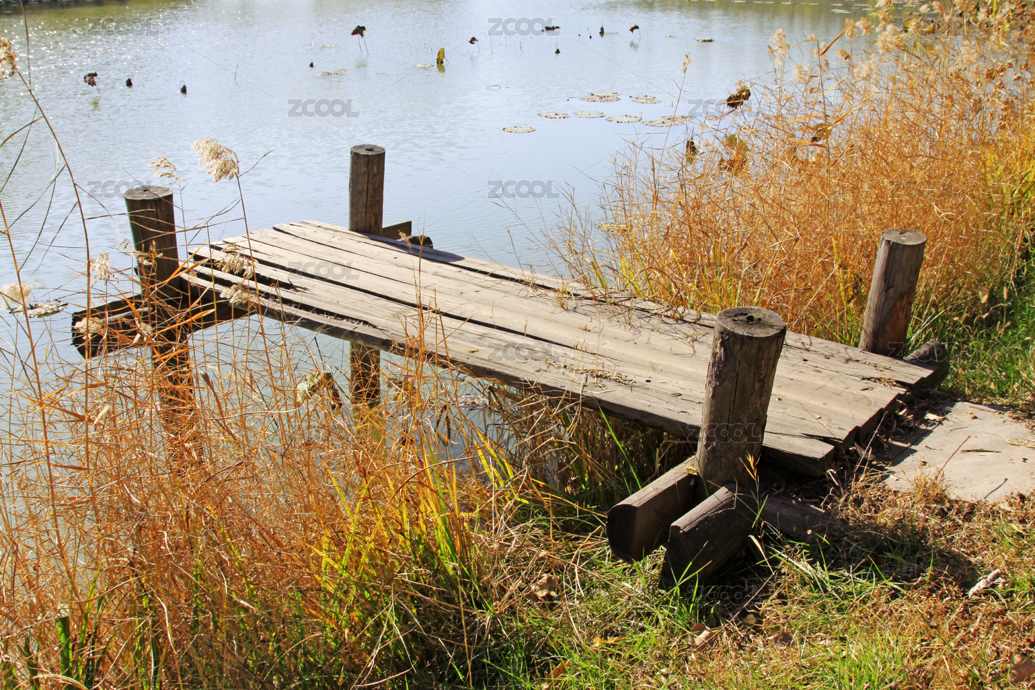 湖邊木橋與蘆葦叢
