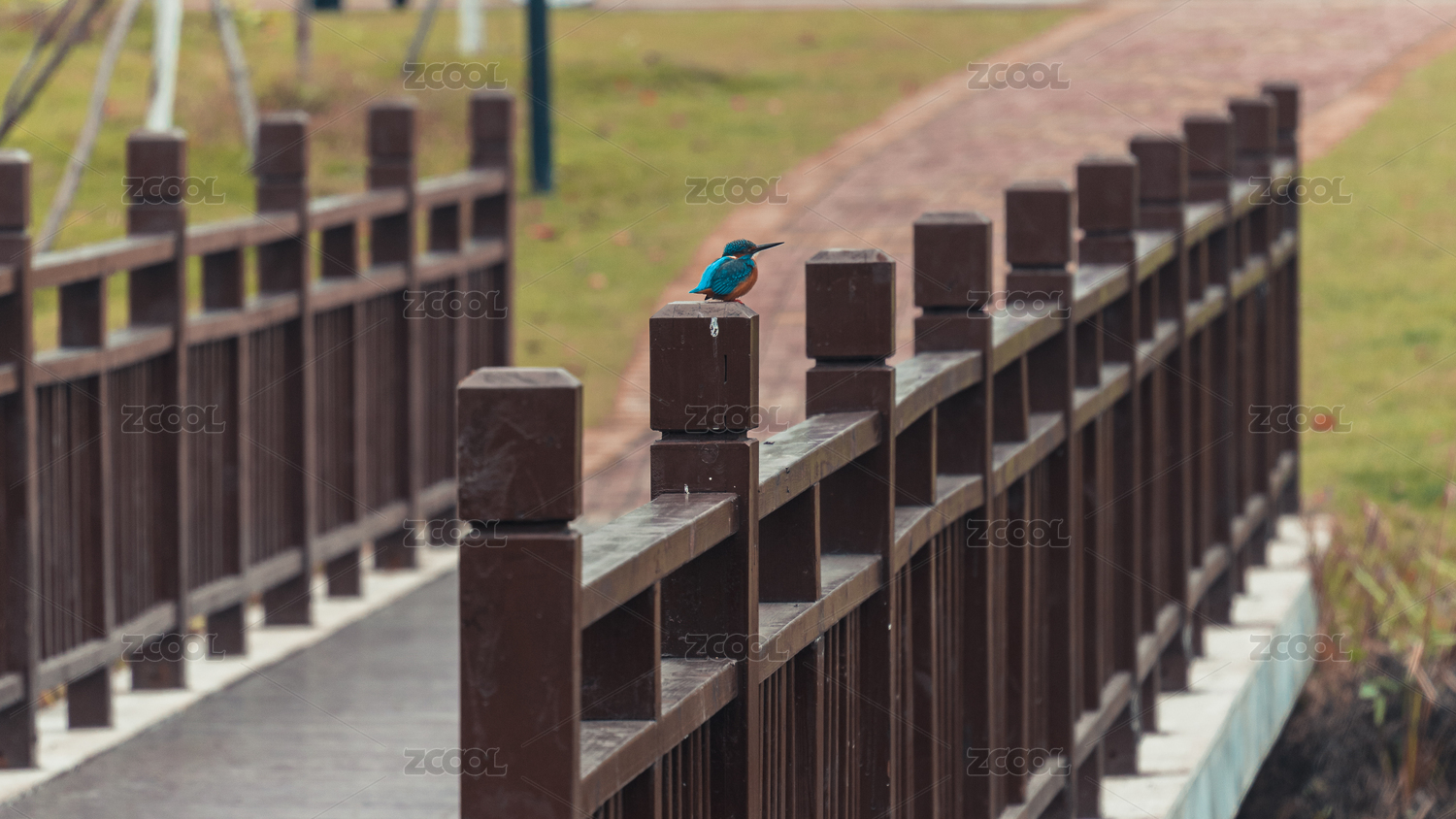 公園里一只藍(lán)色的翠鳥停在木橋圍欄上休息