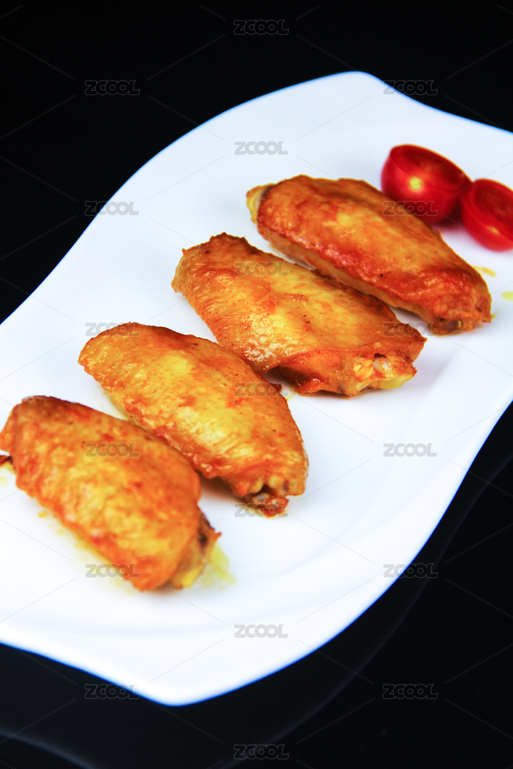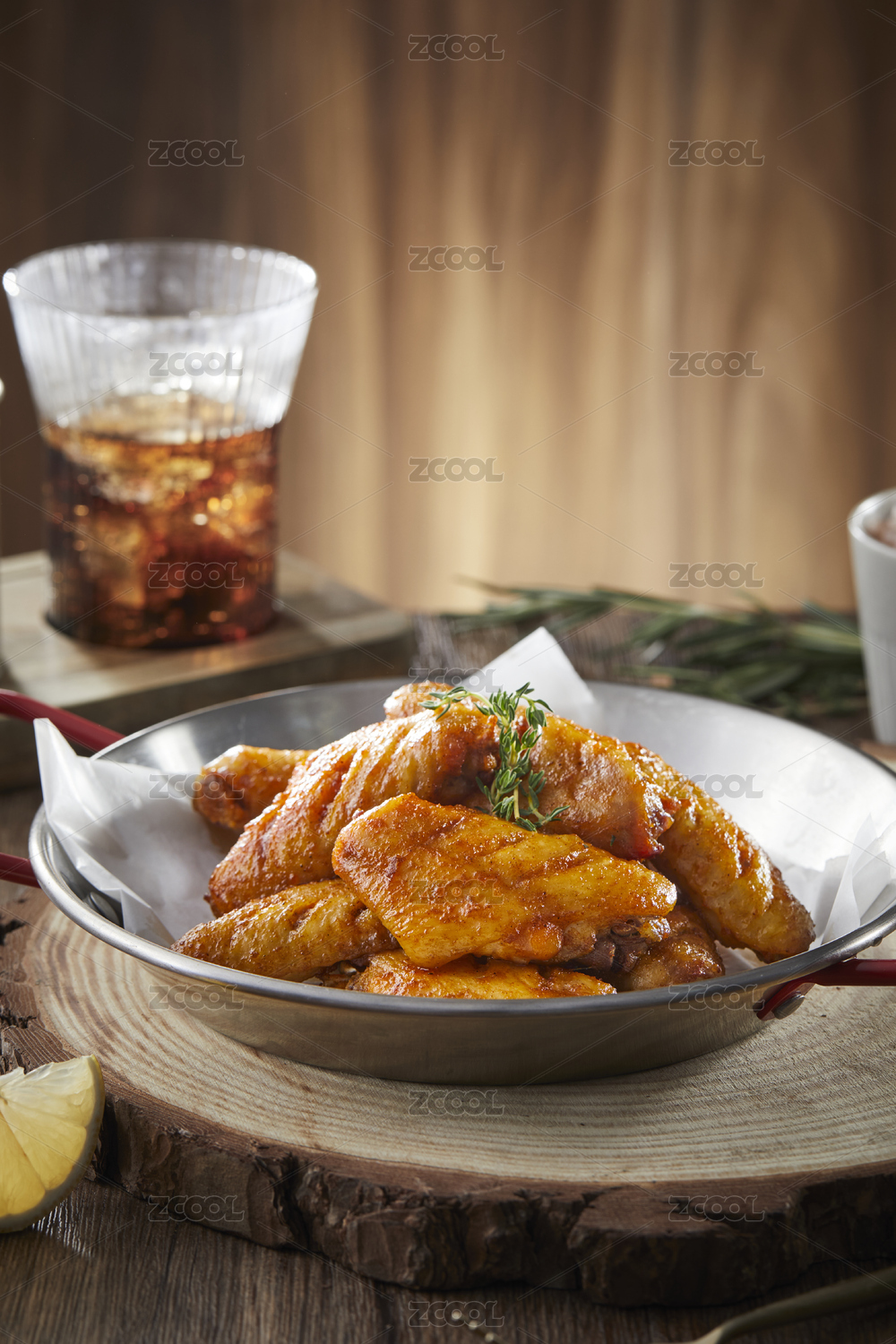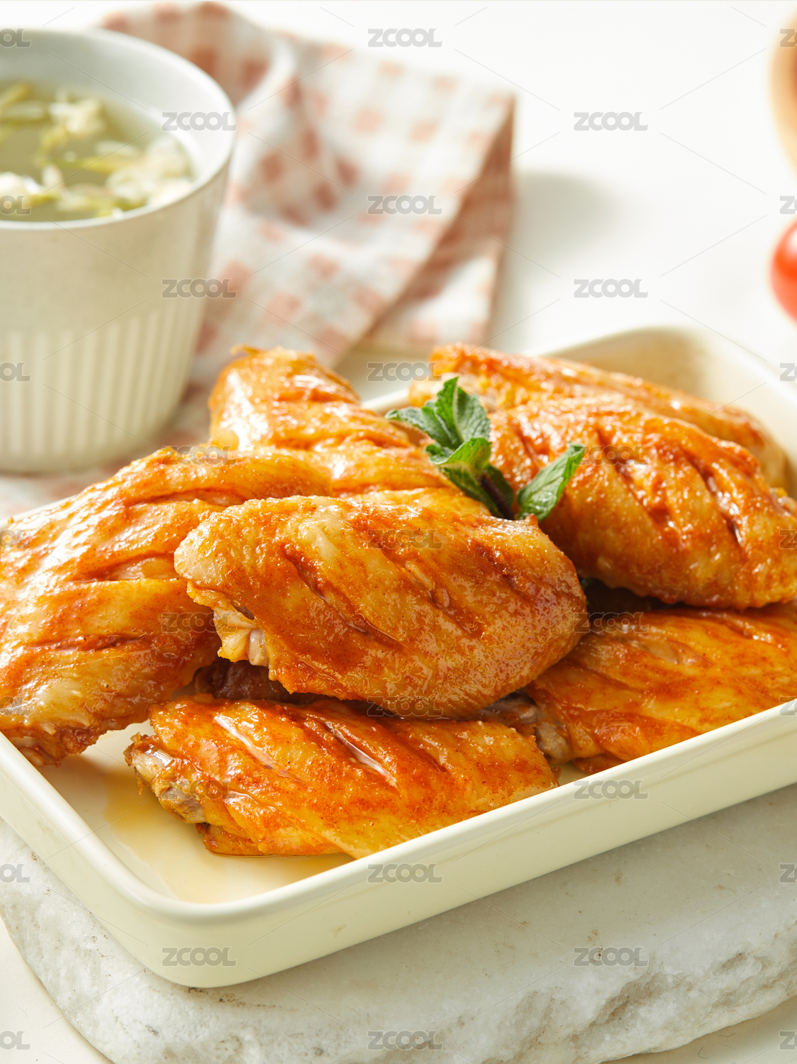 草墊上方盤(pán)里的奧爾良烤雞翅