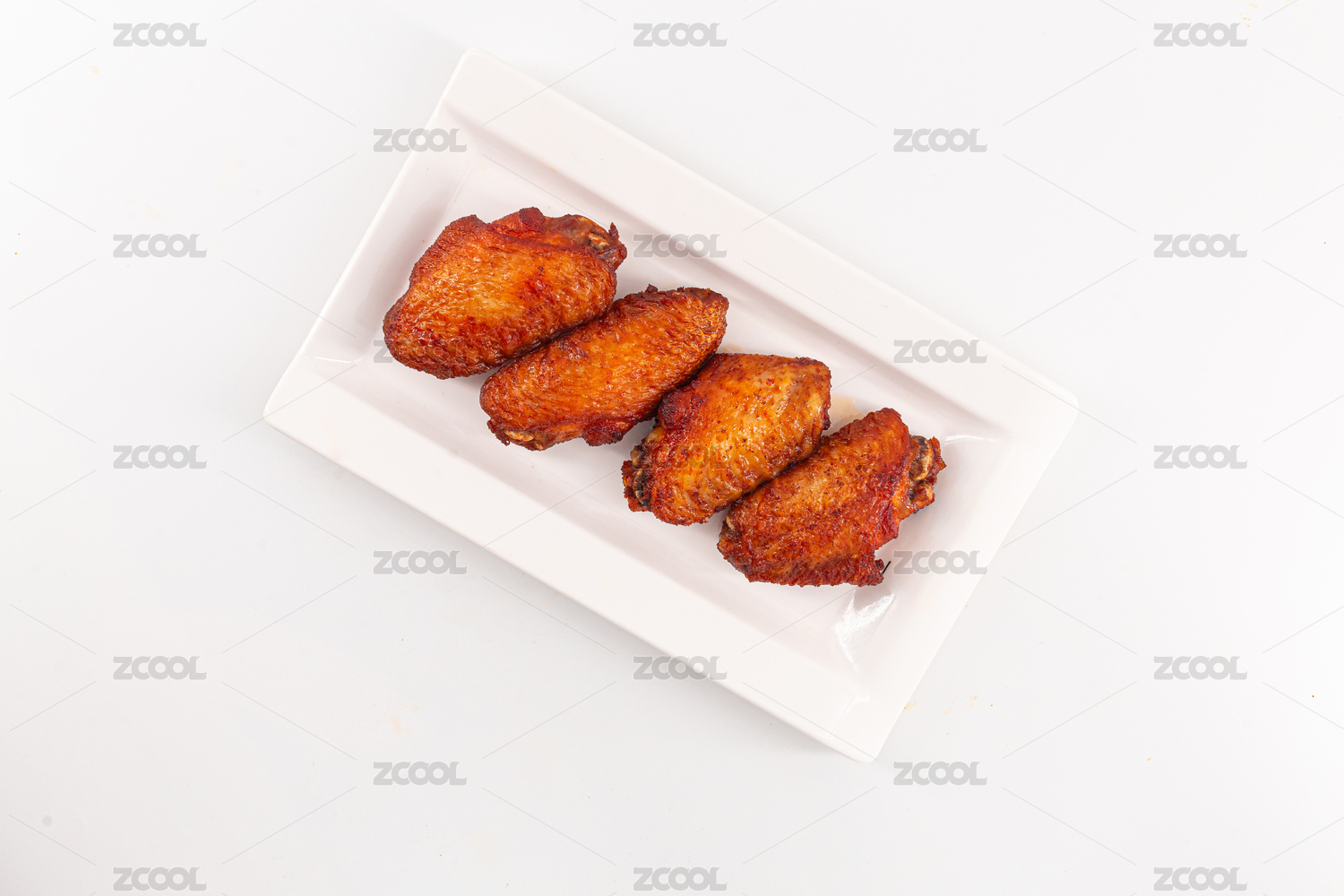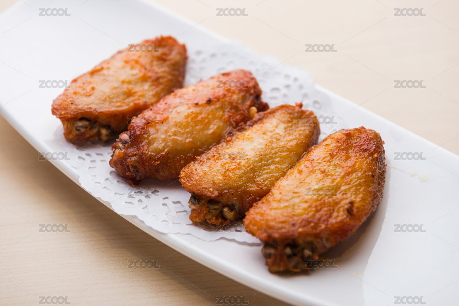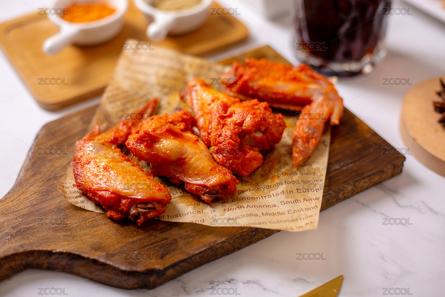 草墊上方盤(pán)里的麻辣奧爾良烤雞翅