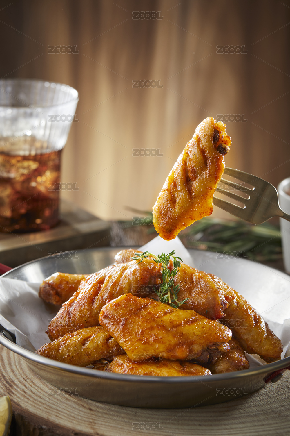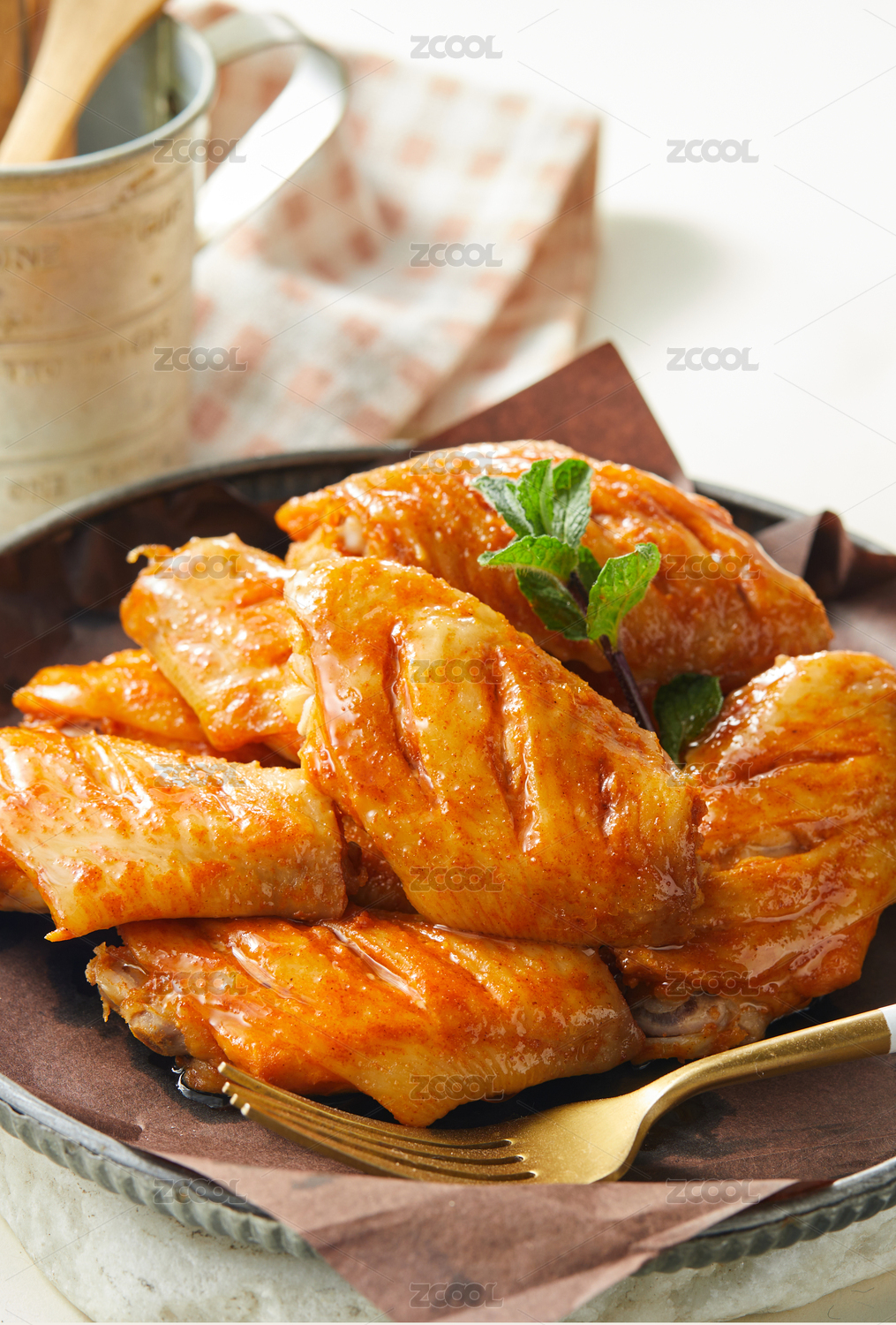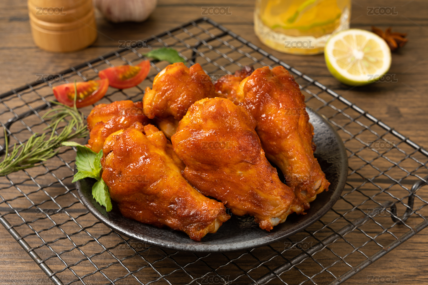 草墊上方盤(pán)里的麻辣奧爾良烤雞翅