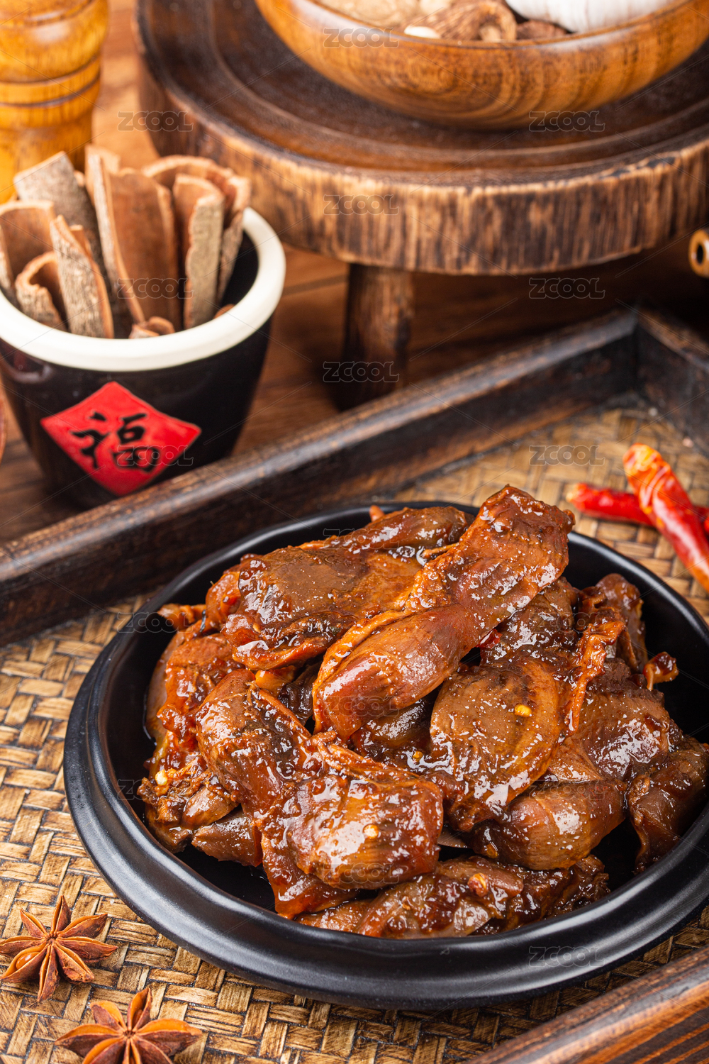 木桌上的一份麻辣鴨胗
