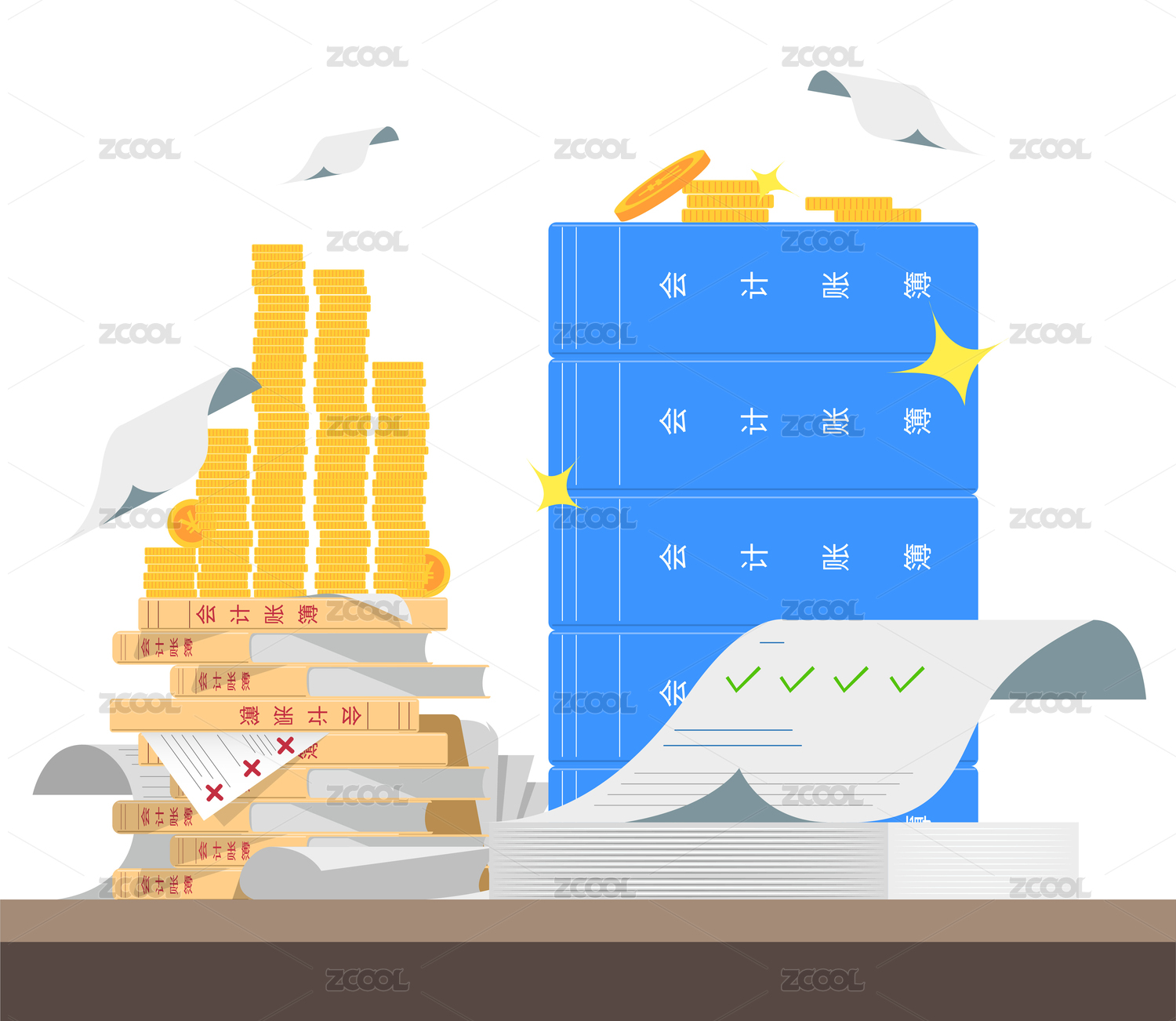 堆疊雜亂的賬簿和堆疊整齊的賬簿上面放著一堆金幣,寓意花更少的錢獲得更專業(yè)的記賬服務