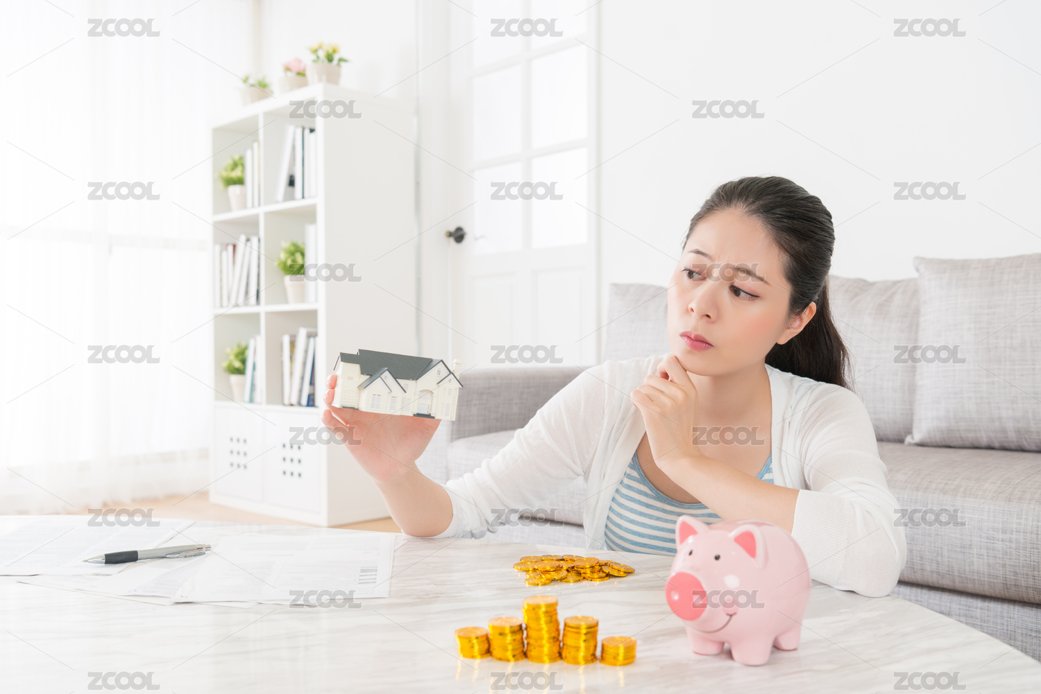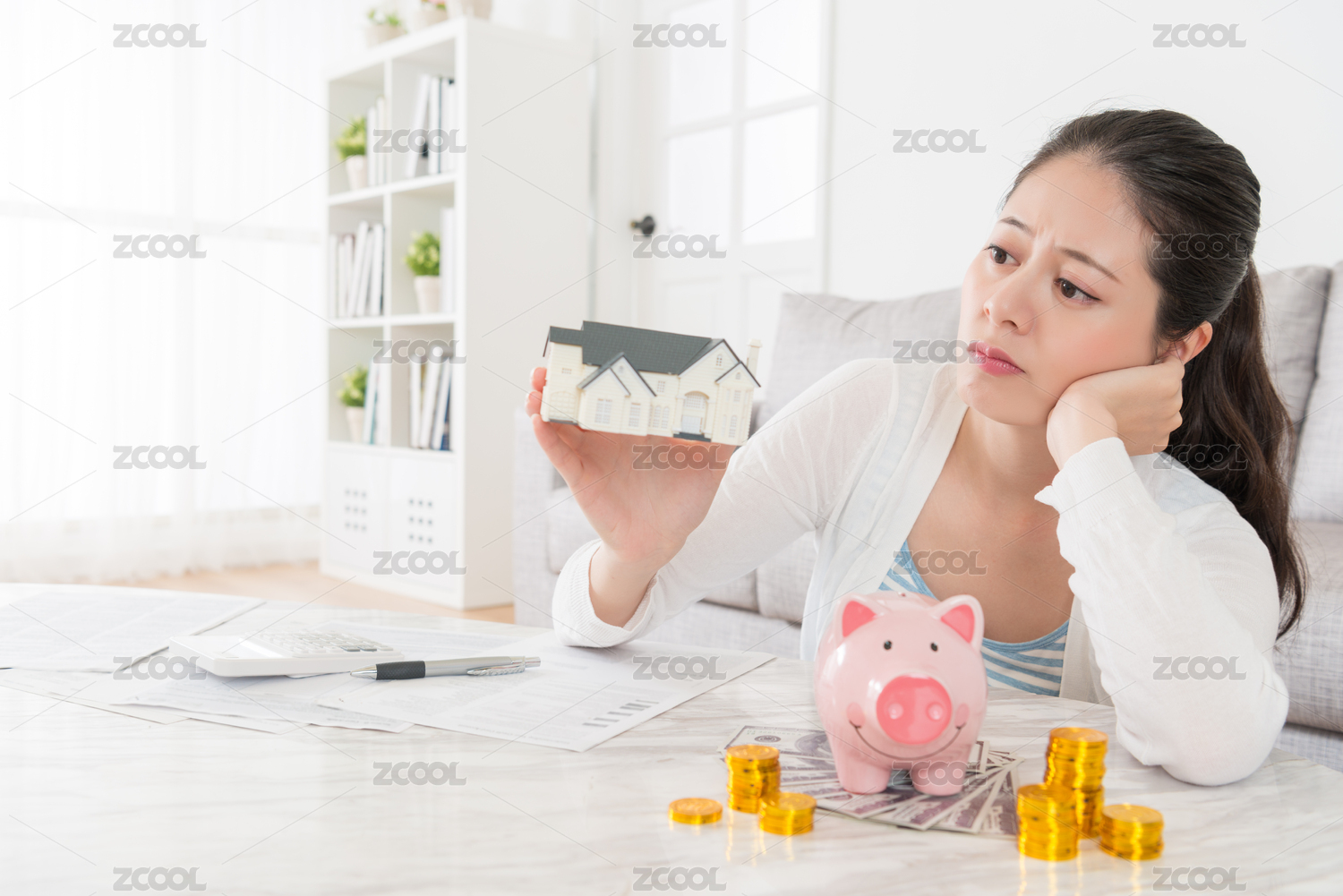 美麗漂亮的女孩女士拿著小房子模型,看著想著如何省錢購買新公寓坐在客廳與儲蓄罐硬幣。