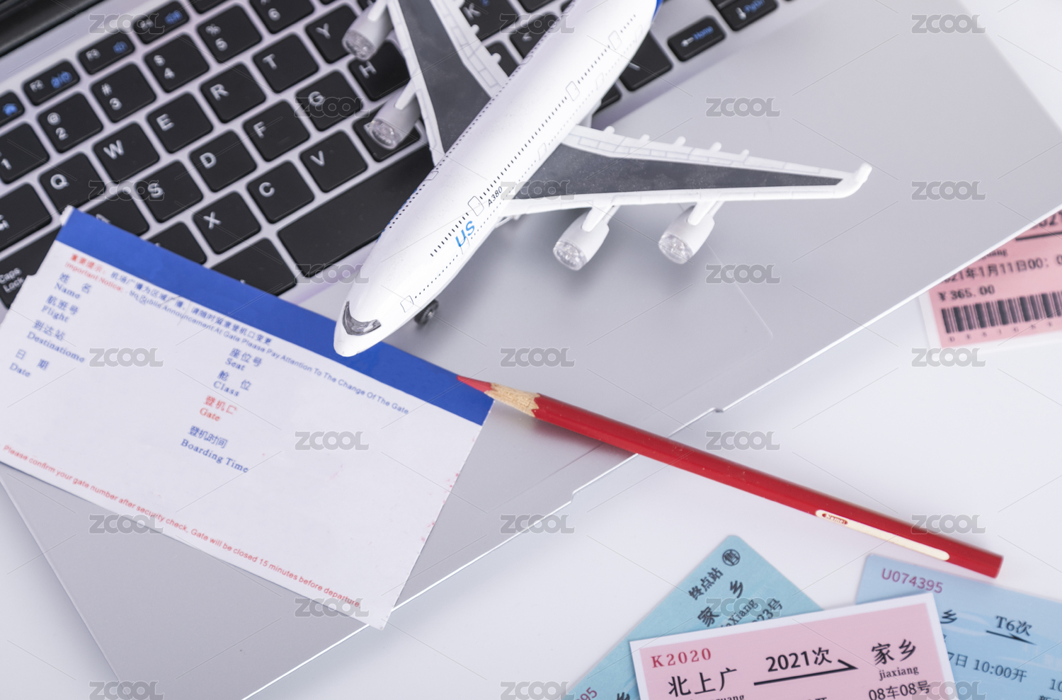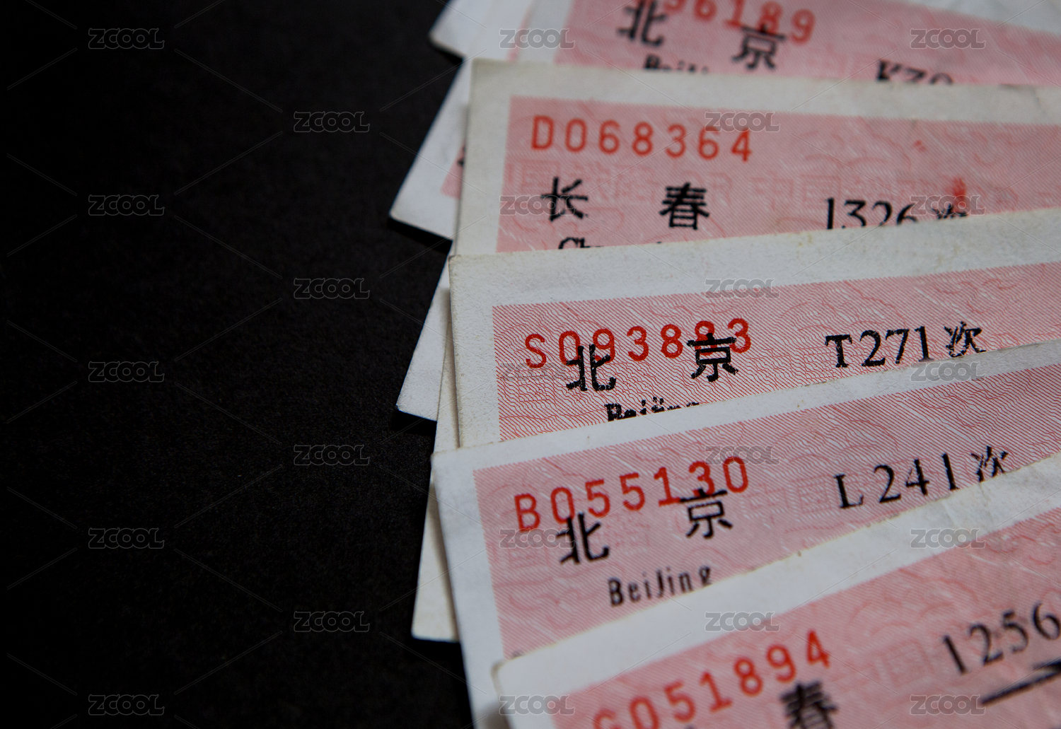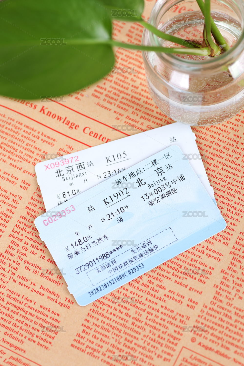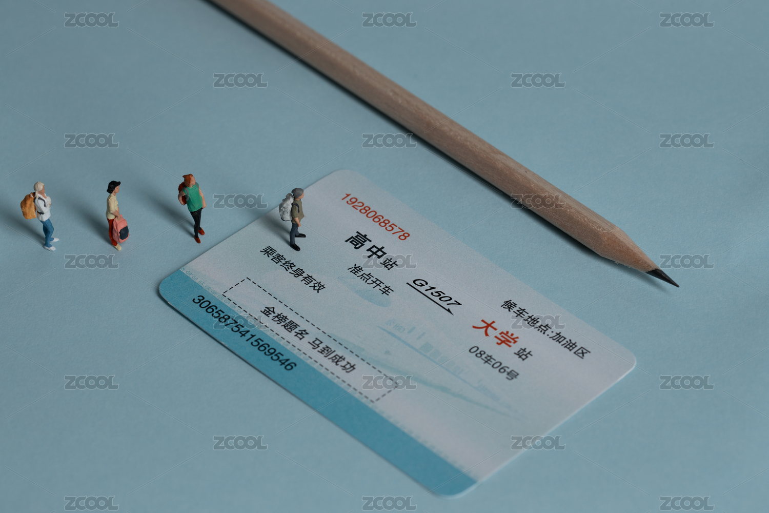 藍(lán)色卡紙上火車(chē)票和鉛筆