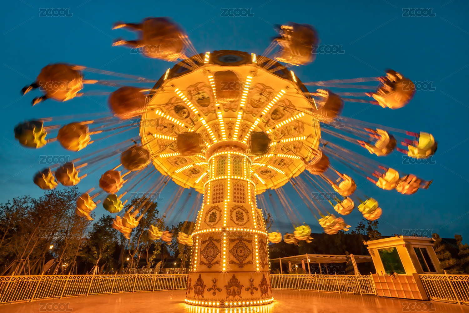 夜幕下的臺(tái)州方特狂野大陸游樂(lè)場(chǎng)的旋轉(zhuǎn)飛椅